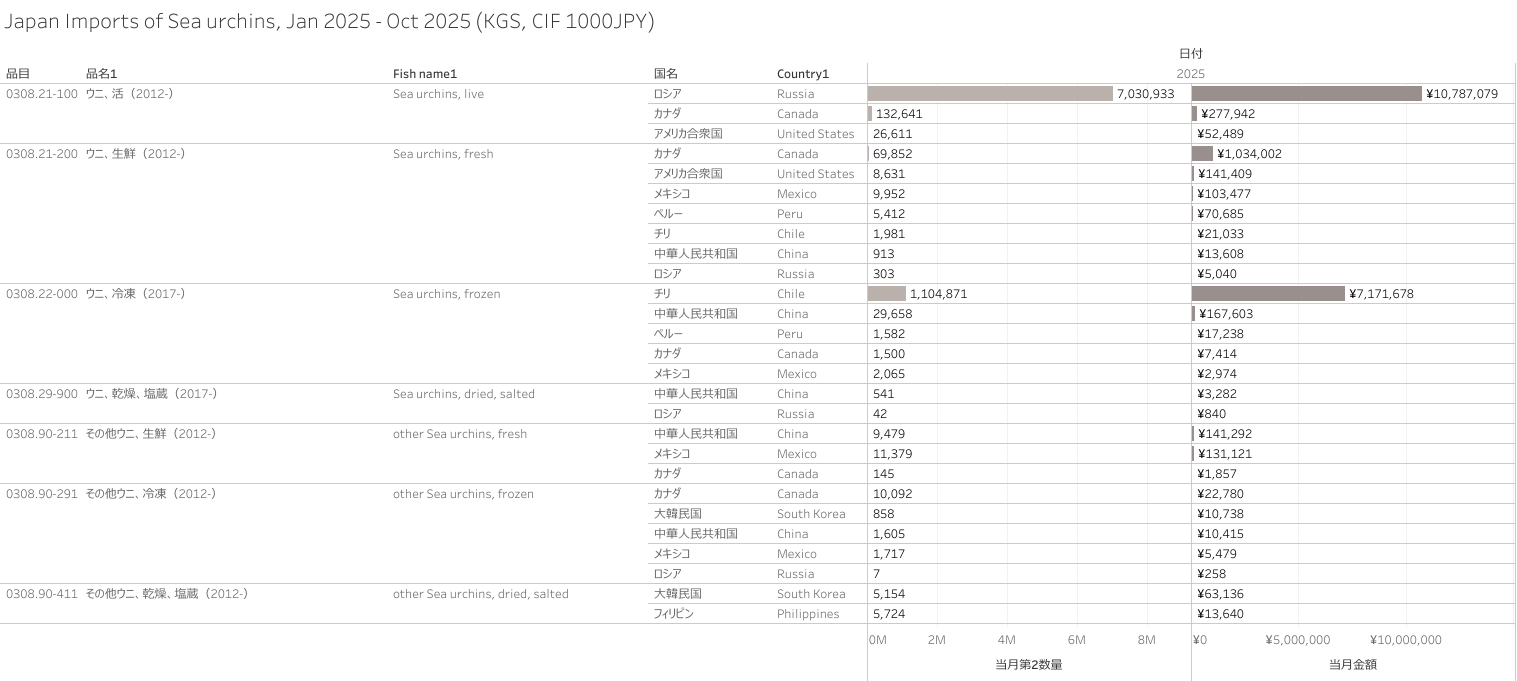 日本 ウニ(HS-03)輸入統計 2025年01月-10月