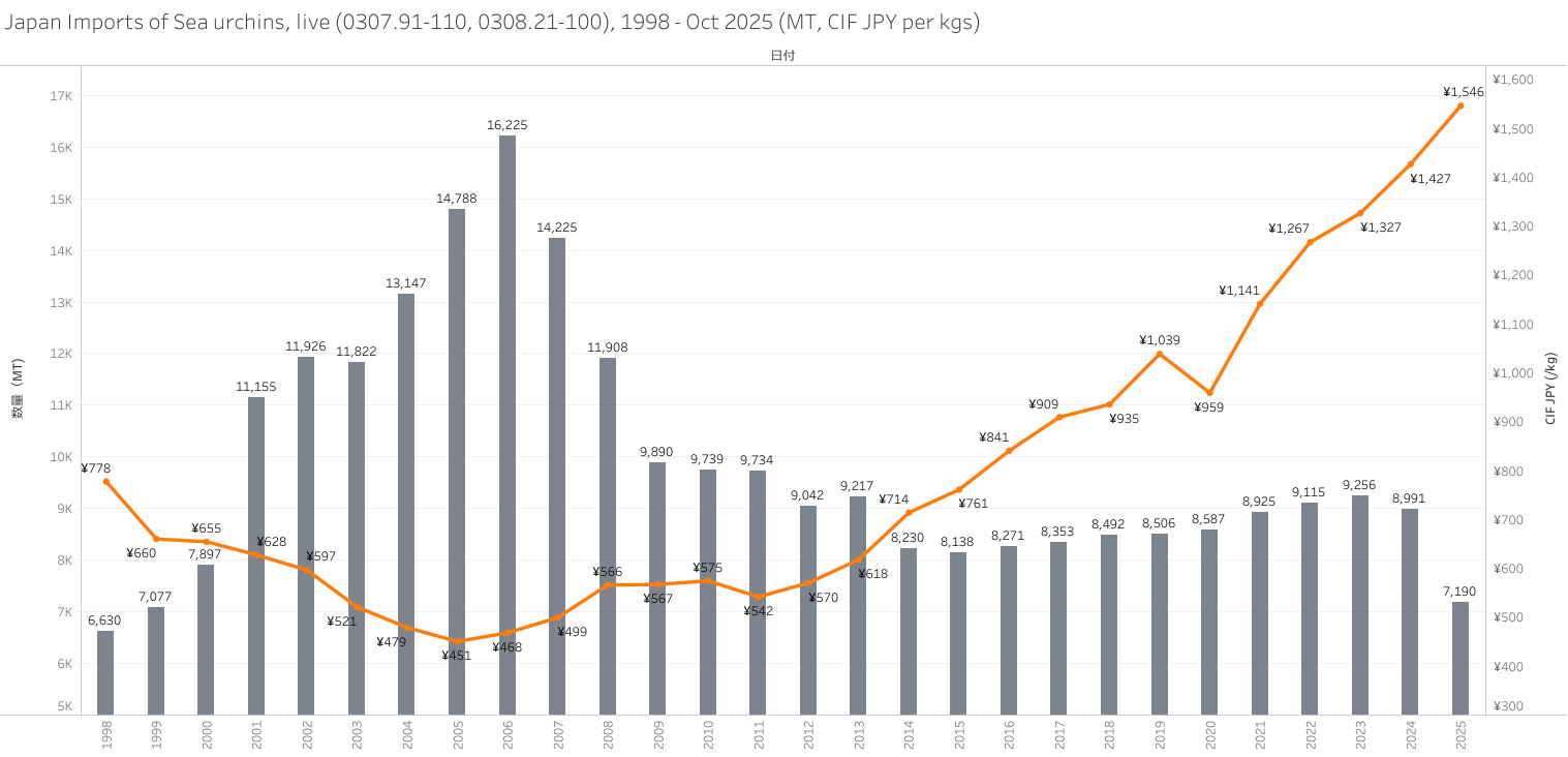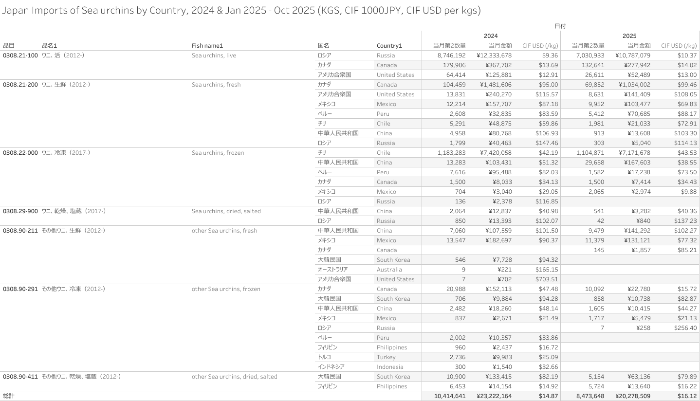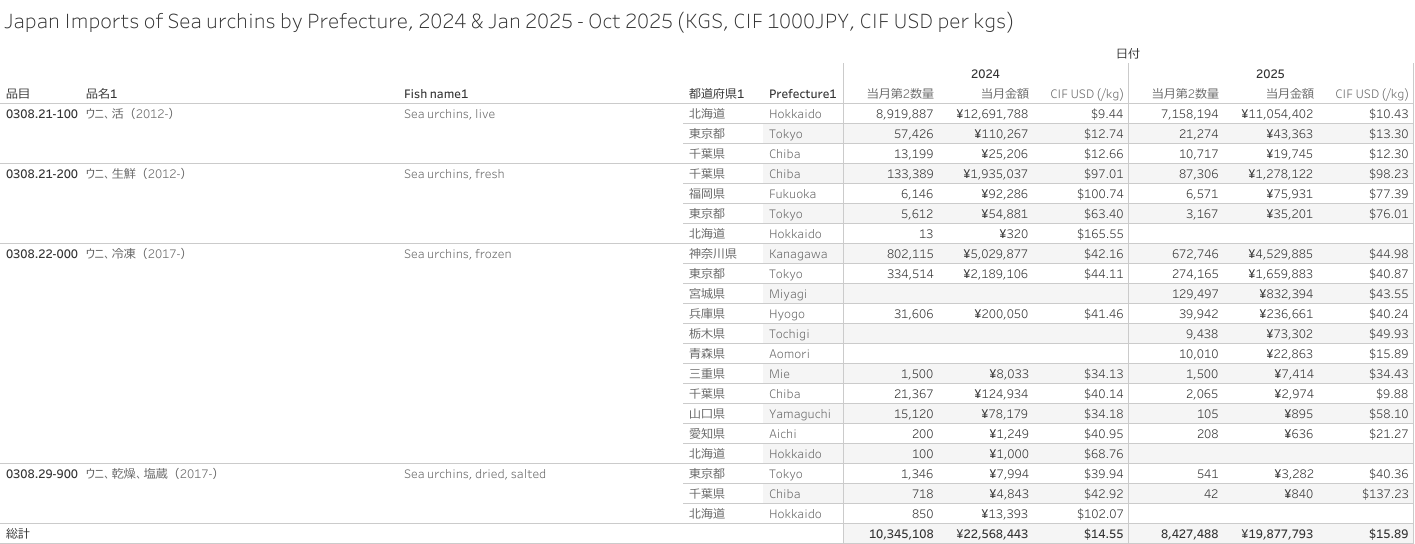 Japan Imports of Sea urchins (HS-03) Jan 2025 - Oct 2025