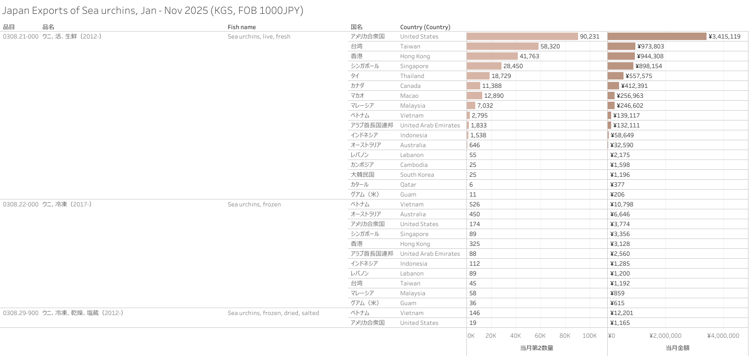 日本 ウニ(HS-03)輸出統計 2025年01月-11月
