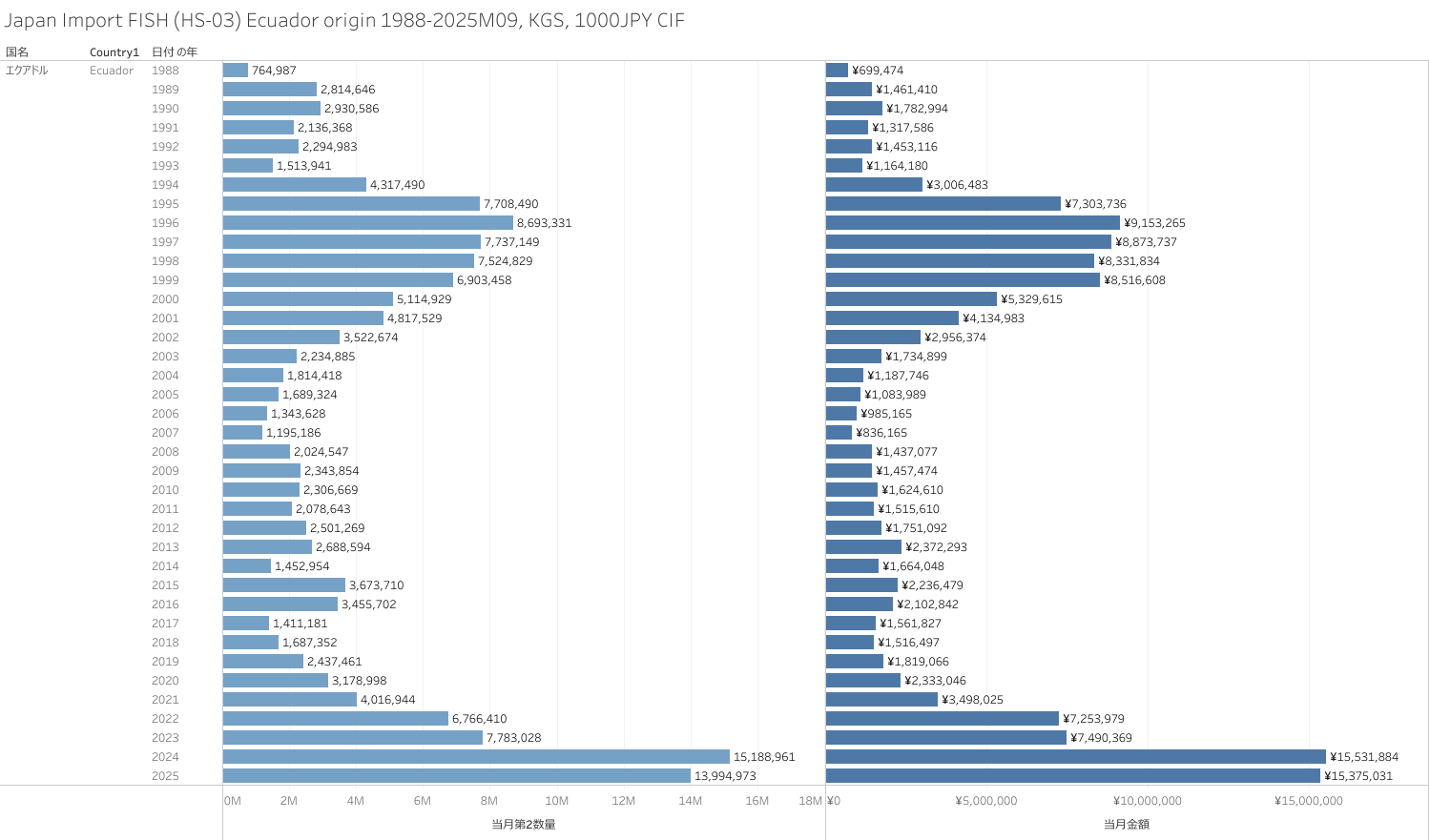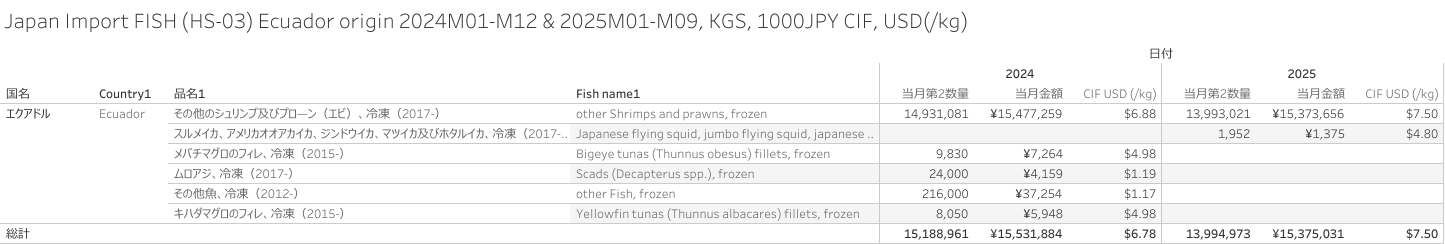 日本 エクアドル産水産物(HS-03)輸入統計 2025年09月まで
