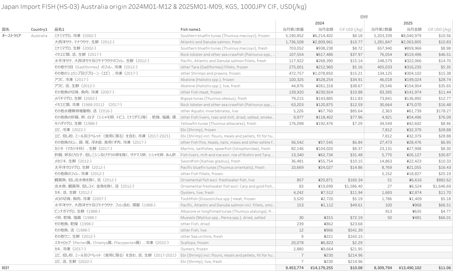 日本 オーストラリア産水産物(HS-03)輸入統計 2025年09月まで