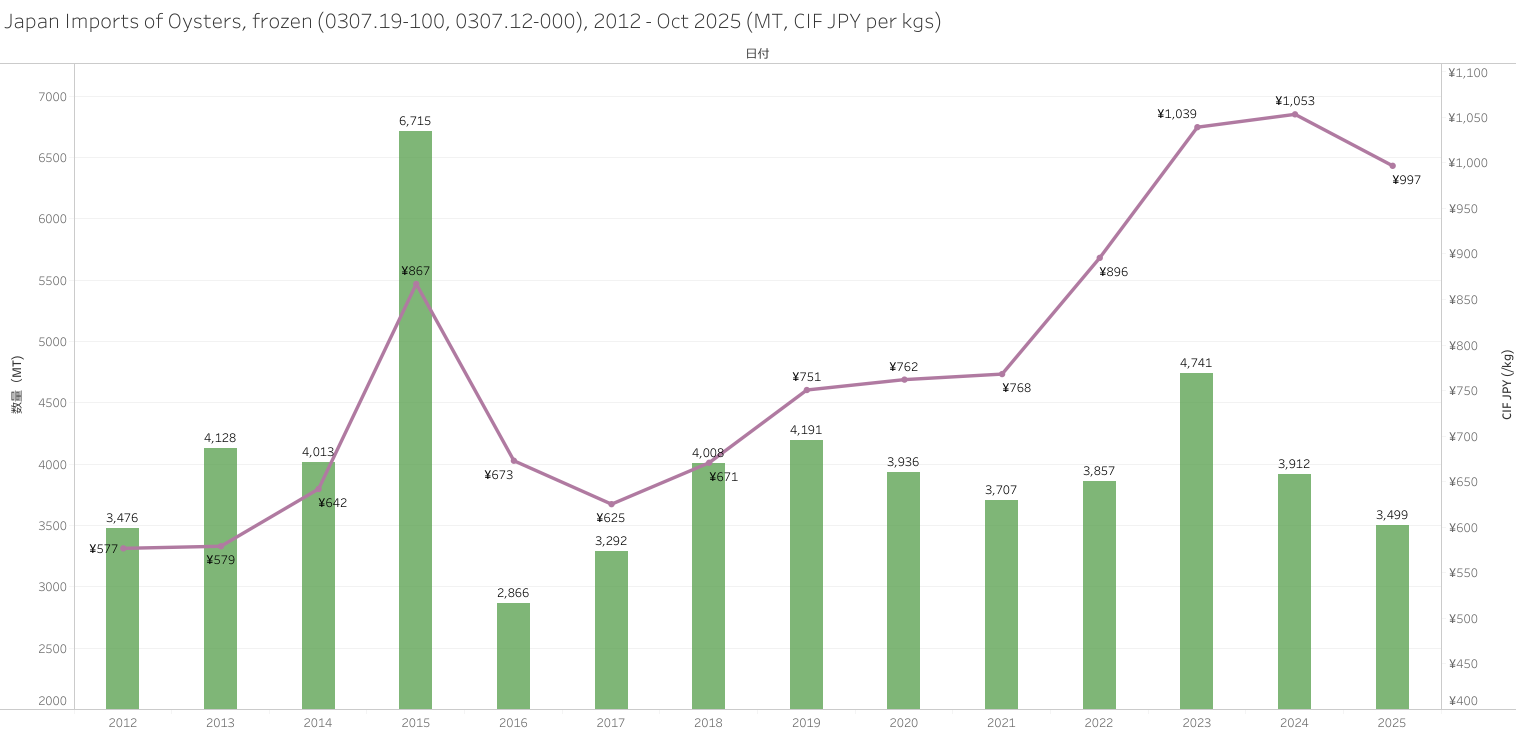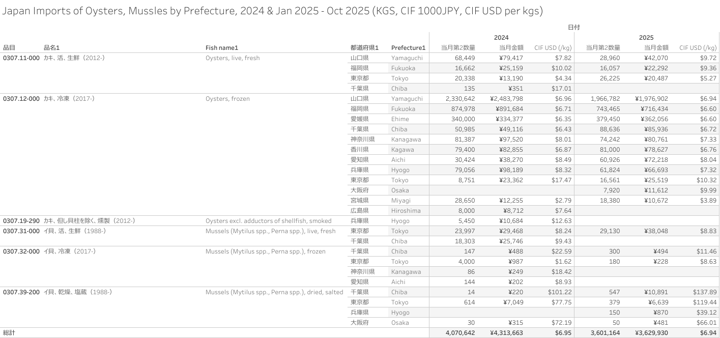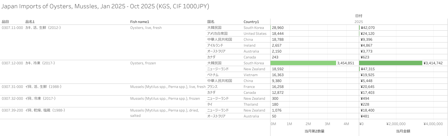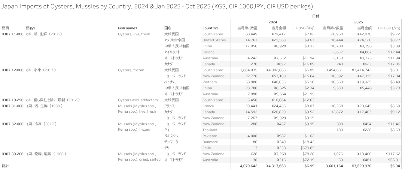 Japan Imports of Oysters, Mussles (HS-03) Jan 2025 - Oct 2025