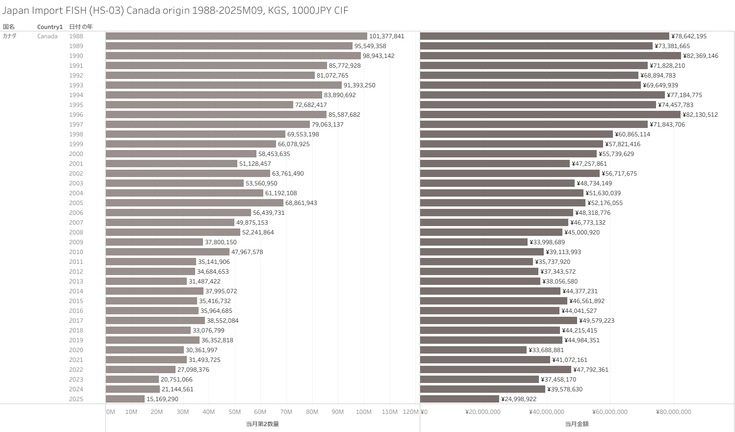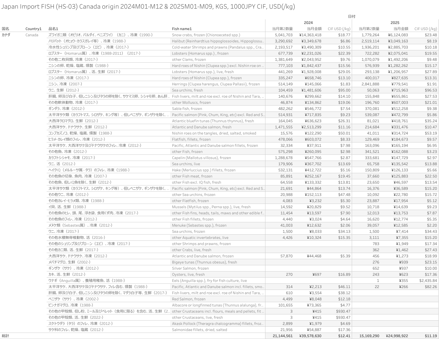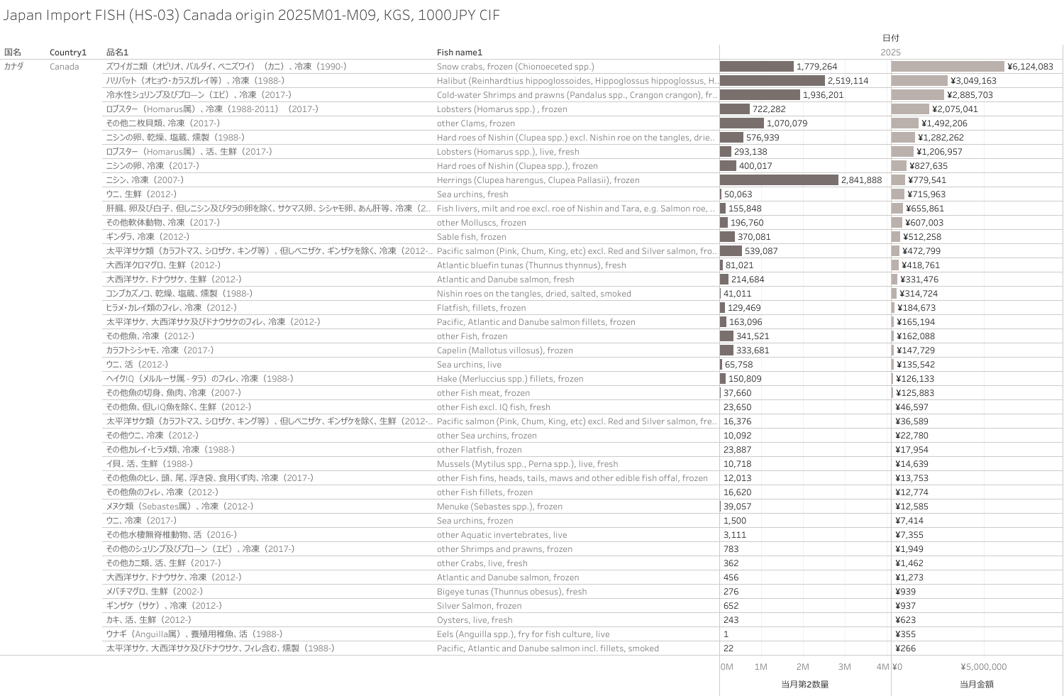 日本 カナダ産水産物(HS-03)輸入統計 2025年09月まで