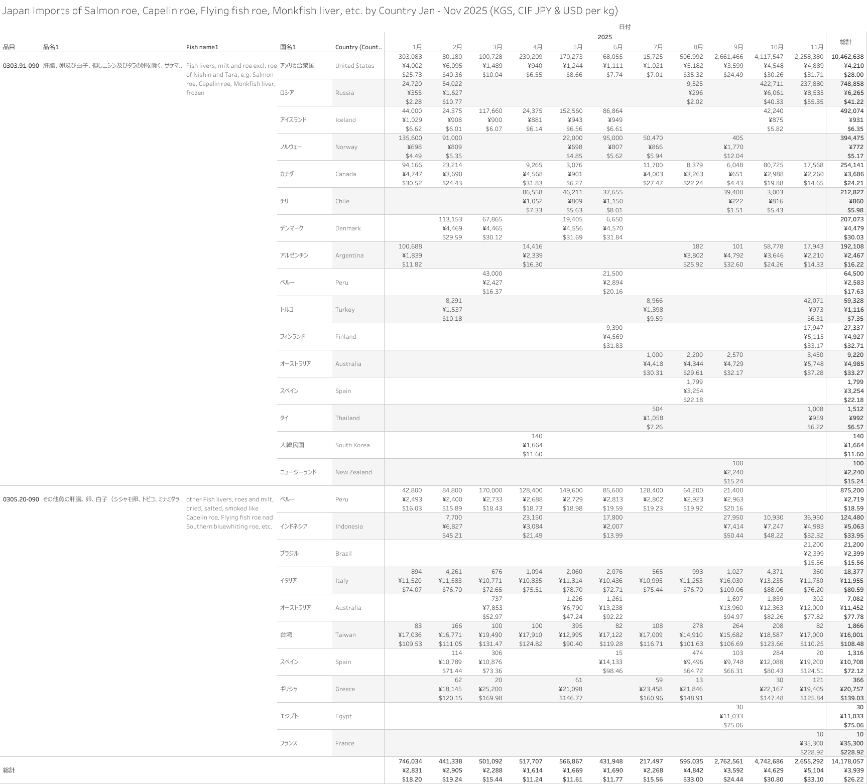 Japan Imports of Frozen Capelin (+Roe) Nov 2025