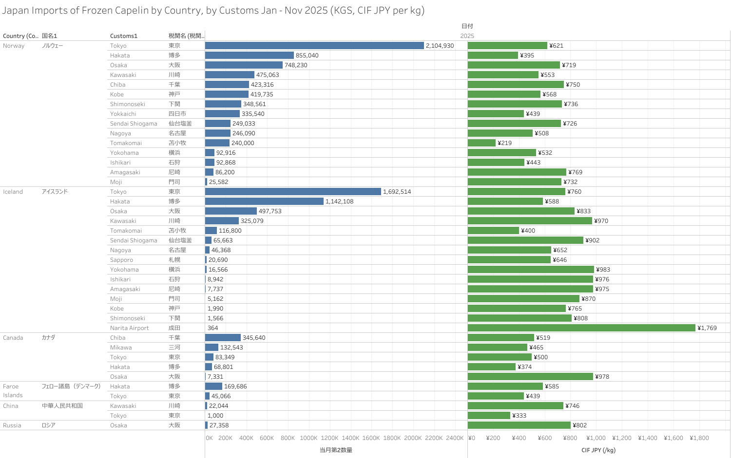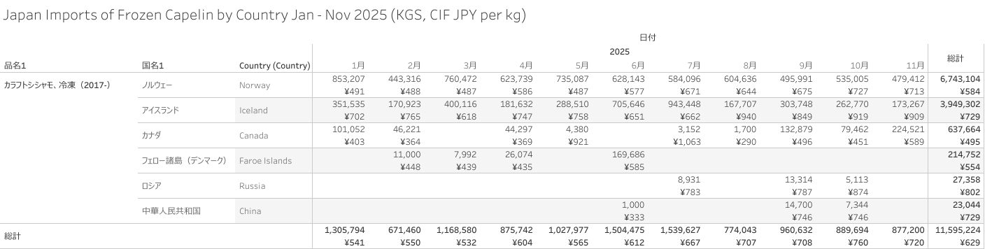 Japan Imports of Frozen Capelin (+Roe) Nov 2025