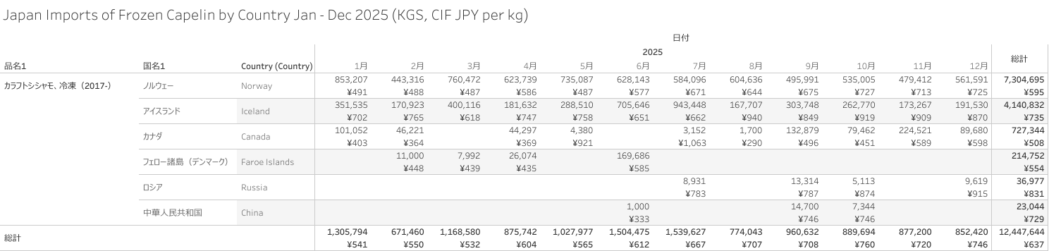 Japan Imports of Frozen Capelin (+Roe) Dec 2025