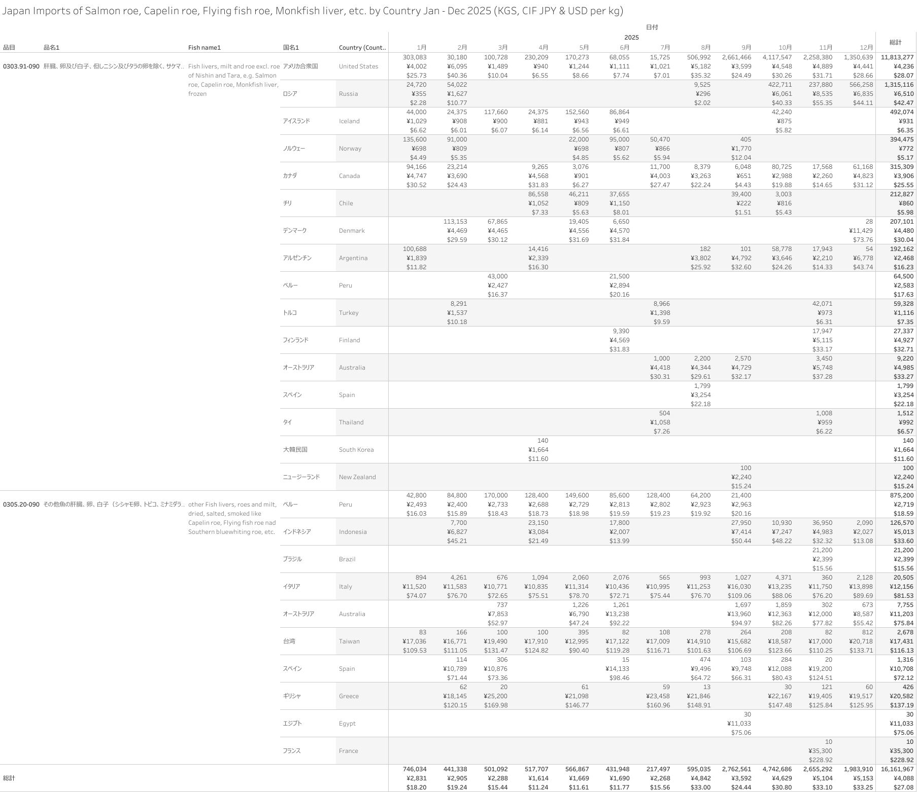 日本 カラフトシシャモ(+卵) 輸入統計 2025年12月まで