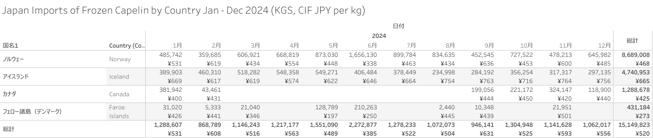 Japan Imports of Frozen Capelin (+Roe) Dec 2025