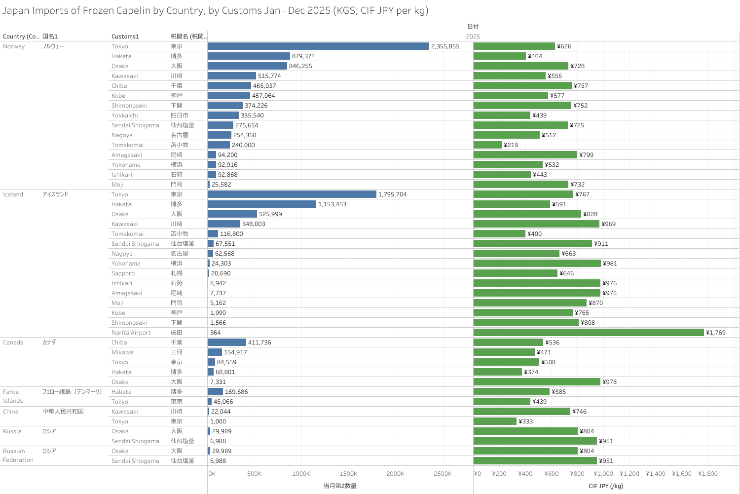 日本 カラフトシシャモ(+卵) 輸入統計 2025年12月まで