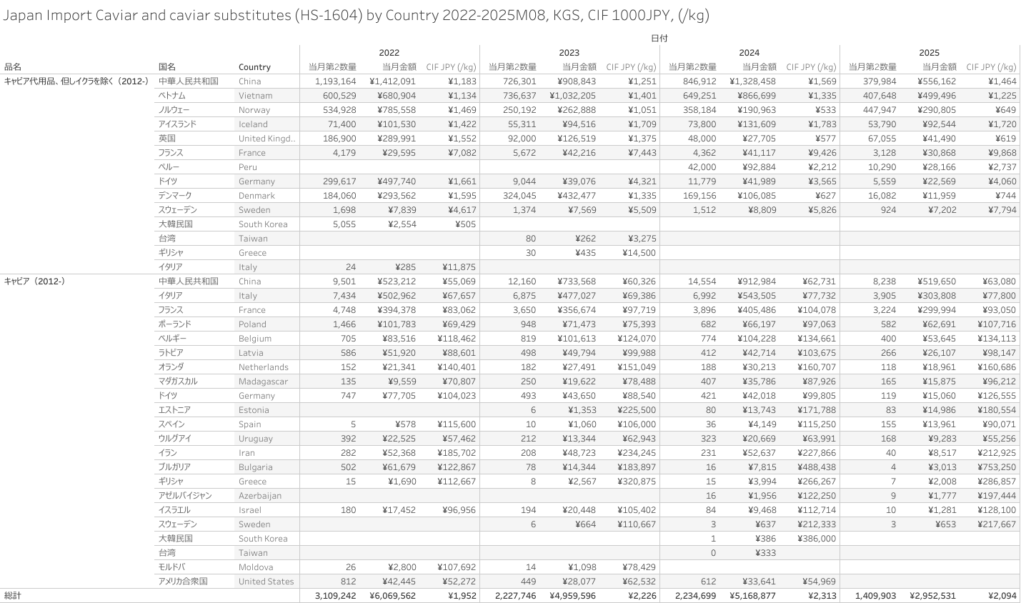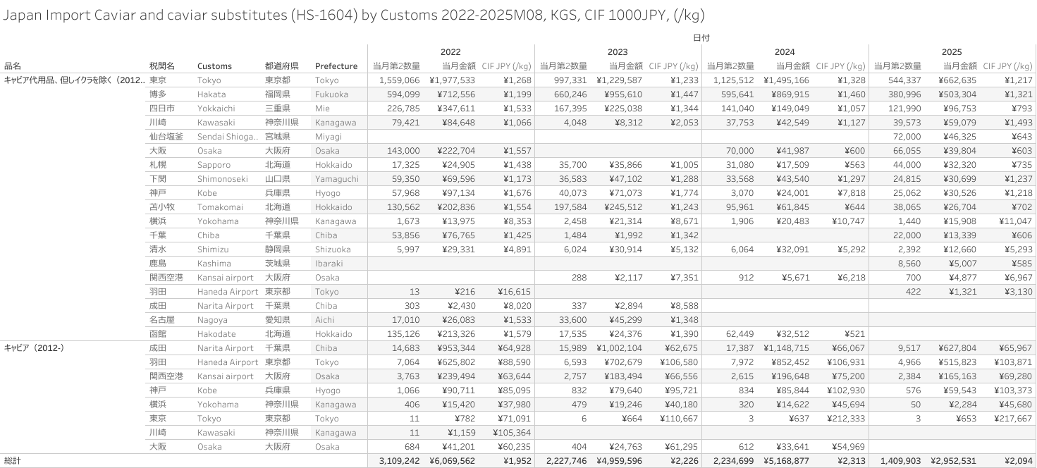 日本 キャビア、キャビア代用品(HS-1604)輸入統計 2025年8月まで