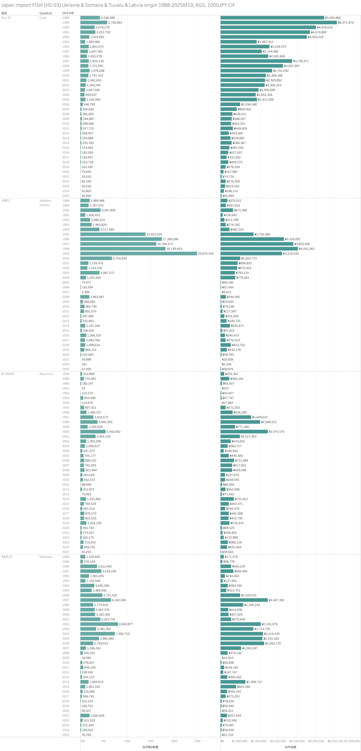 日本 キューバ&ソロモン&モーリシャス&モルディブ産水産物(HS-03)輸入統計 2025年10月まで