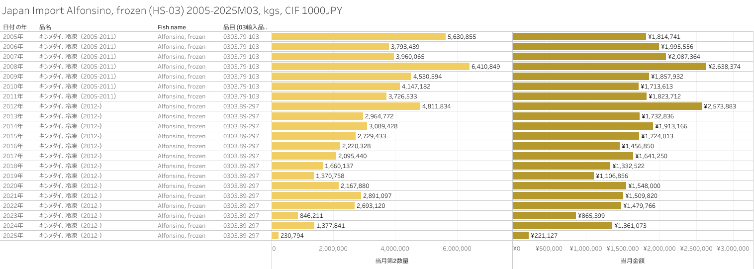 Japan Import Alfonsino, frozen (HS-03) 2005-2025M03