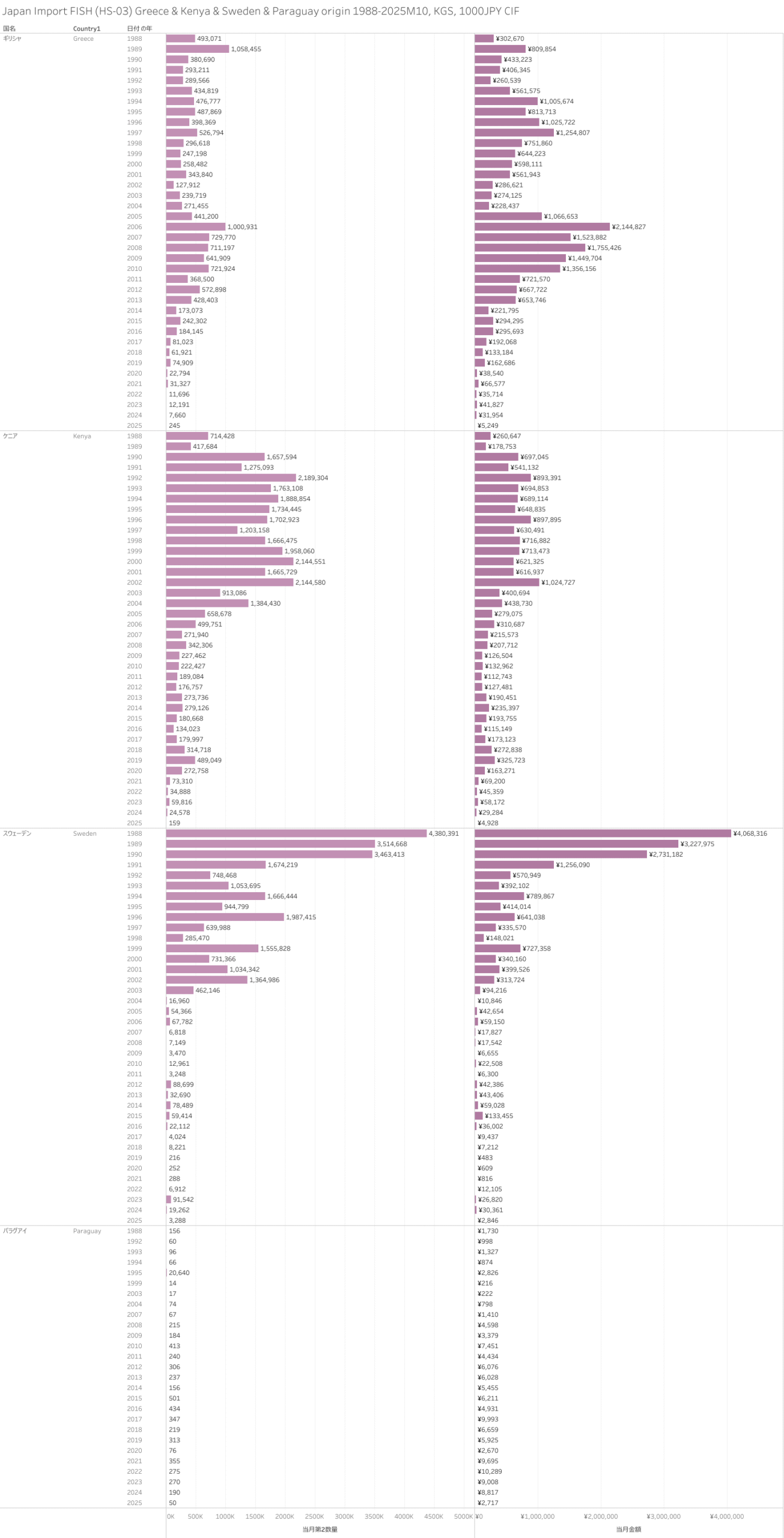 日本 ギリシャ&ケニア&スウェーデン&パラグアイ産水産物(HS-03)輸入統計 2025年10月まで