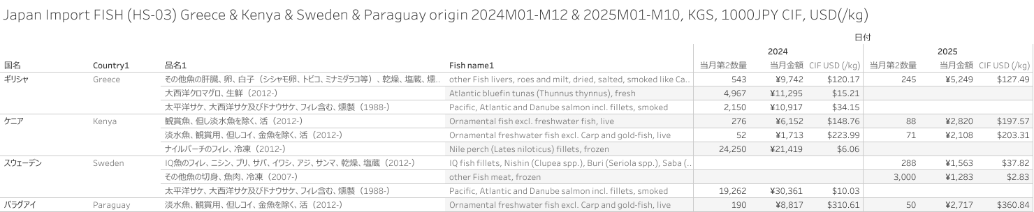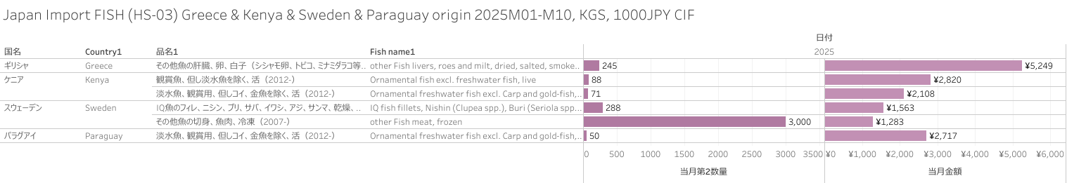 日本 ギリシャ&ケニア&スウェーデン&パラグアイ産水産物(HS-03)輸入統計 2025年10月まで