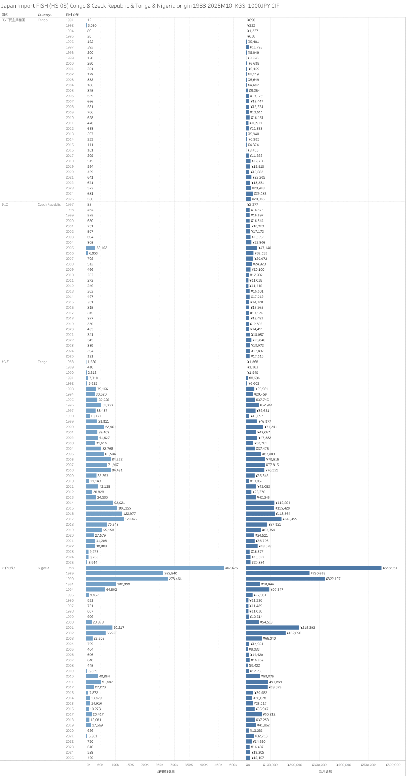 日本 コンゴ民主共和国&チェコ&トンガ&ナイジェリア産水産物(HS-03)輸入統計 2025年10月まで