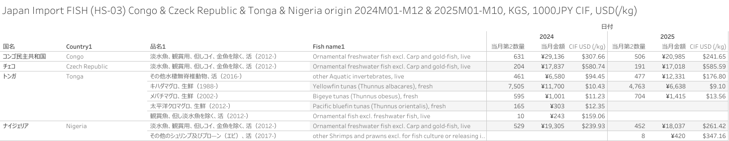 Japan Import FISH (HS-03) Congo & Czeck Republic & Tonga & Nigeria origin 2025M10