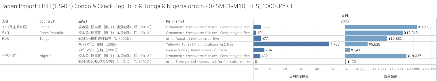 日本 コンゴ民主共和国&チェコ&トンガ&ナイジェリア産水産物(HS-03)輸入統計 2025年10月まで