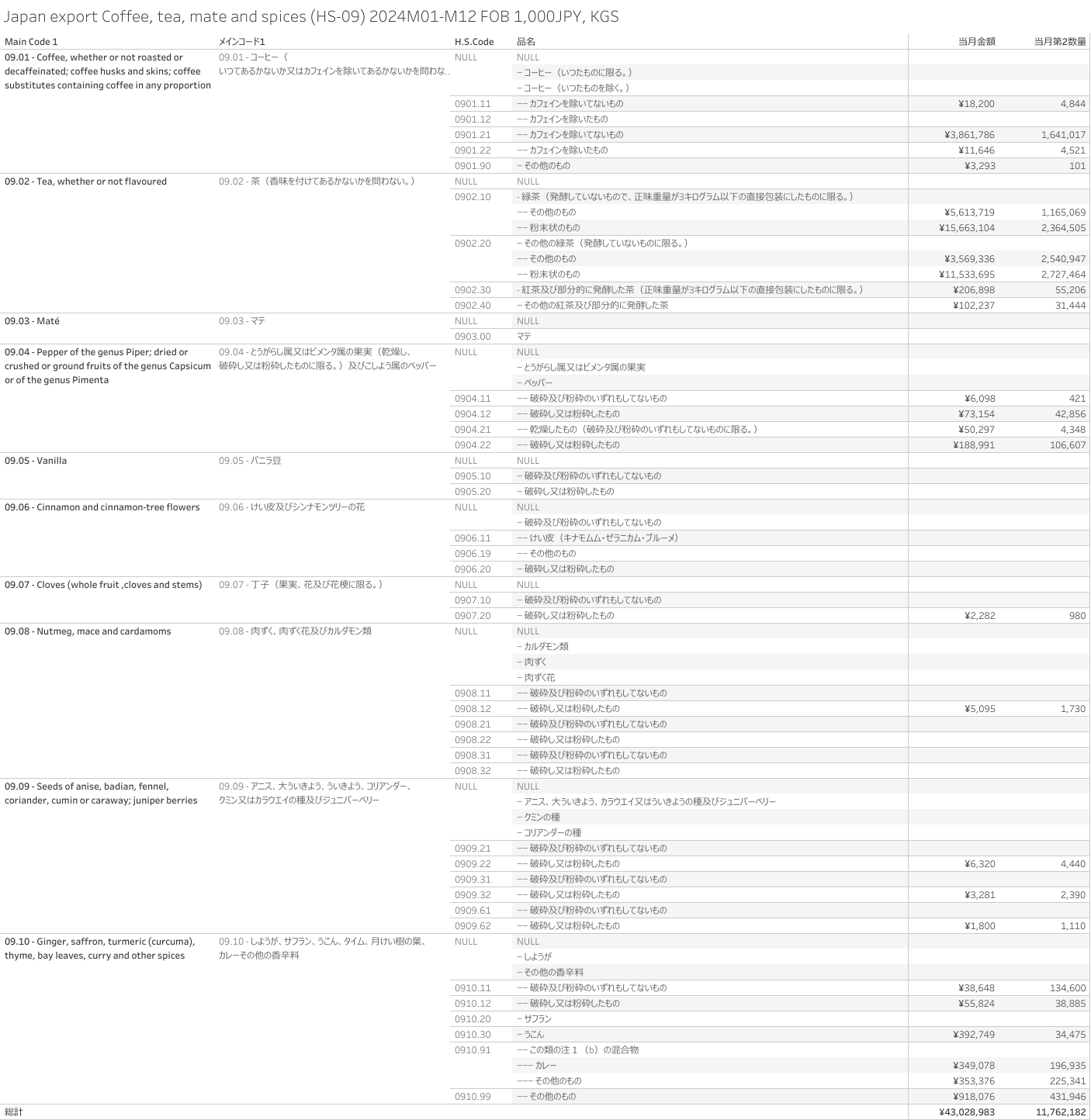 日本 コーヒー、茶、マテ及び香辛料(HS-09)輸出統計 2024年12月まで