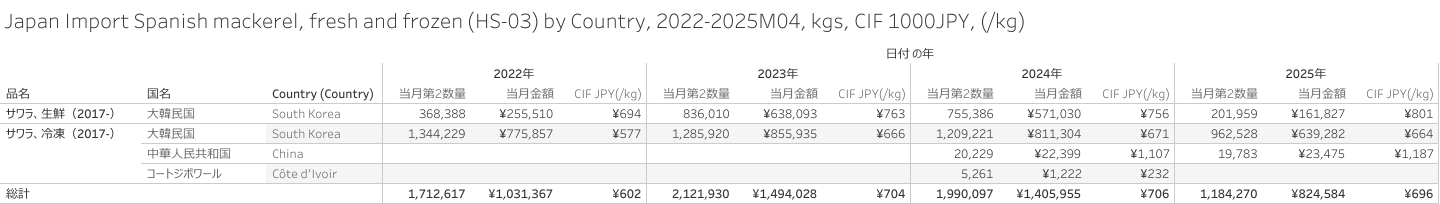 日本 サワラ、生鮮、冷凍(HS-03)輸入統計 1988年-2025年4月