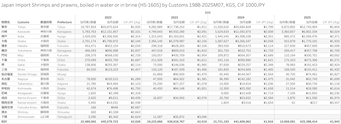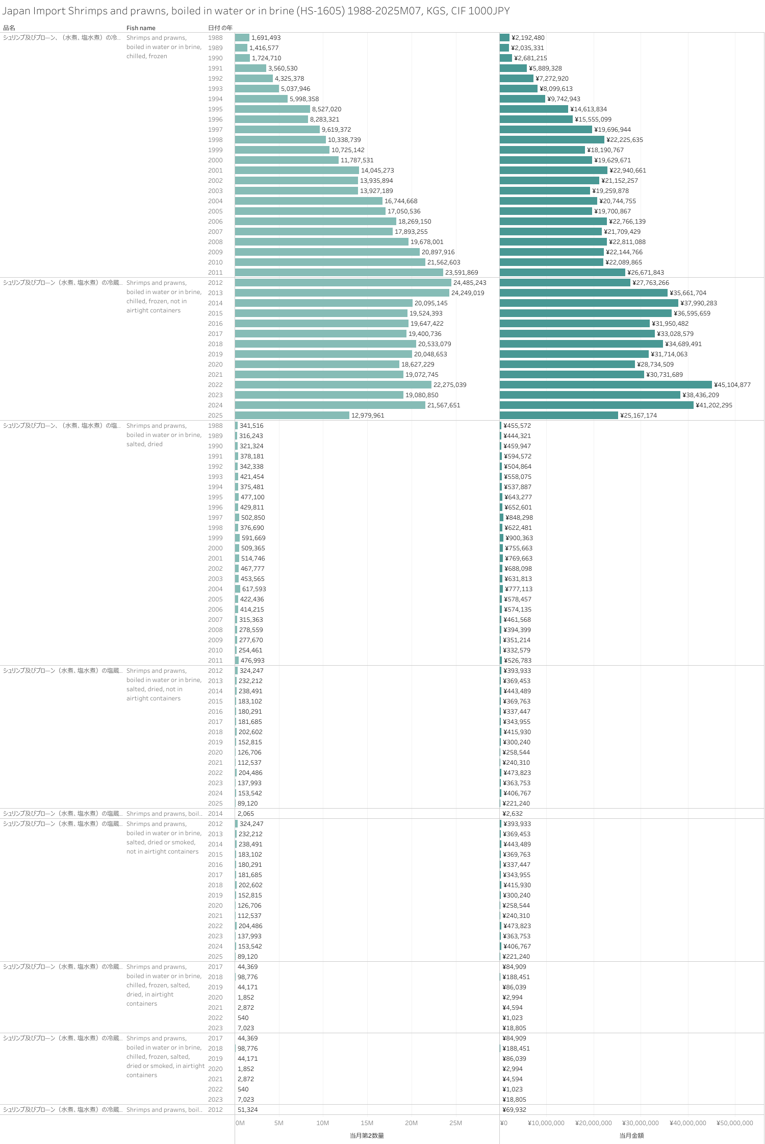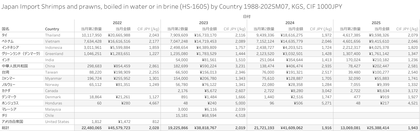 日本 シュリンプ及びプロ―ン(水煮、塩水煮)(HS-1605)輸入統計 2025年7月まで