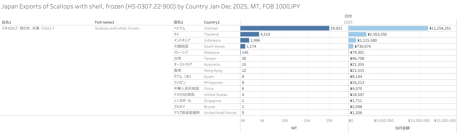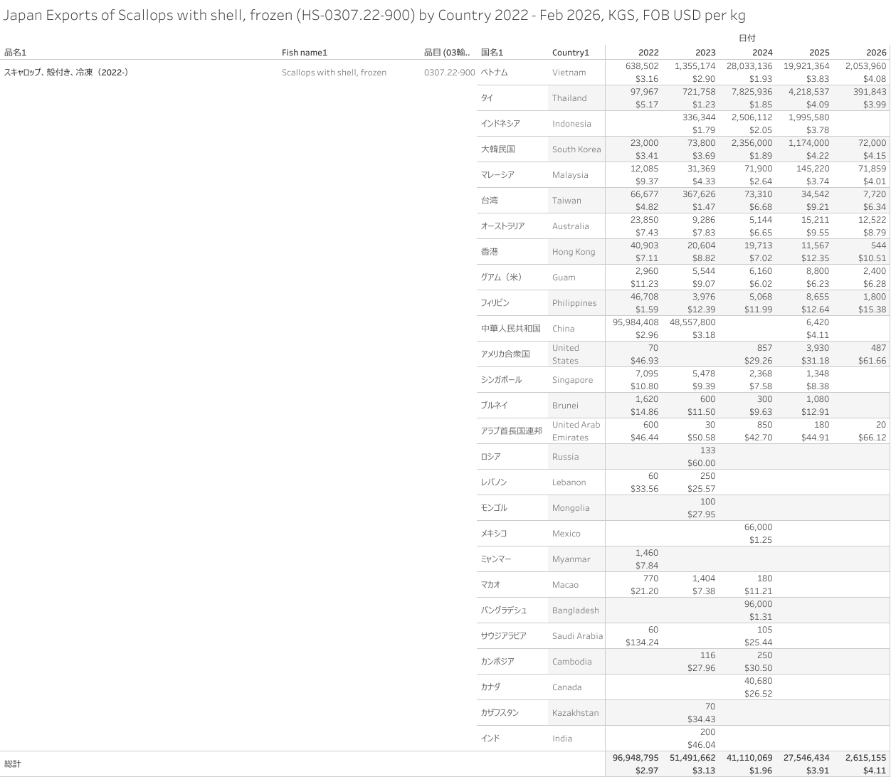 日本 スキャロップ、殻付き(0307.22-900)輸出統計 2022年-2026年2月