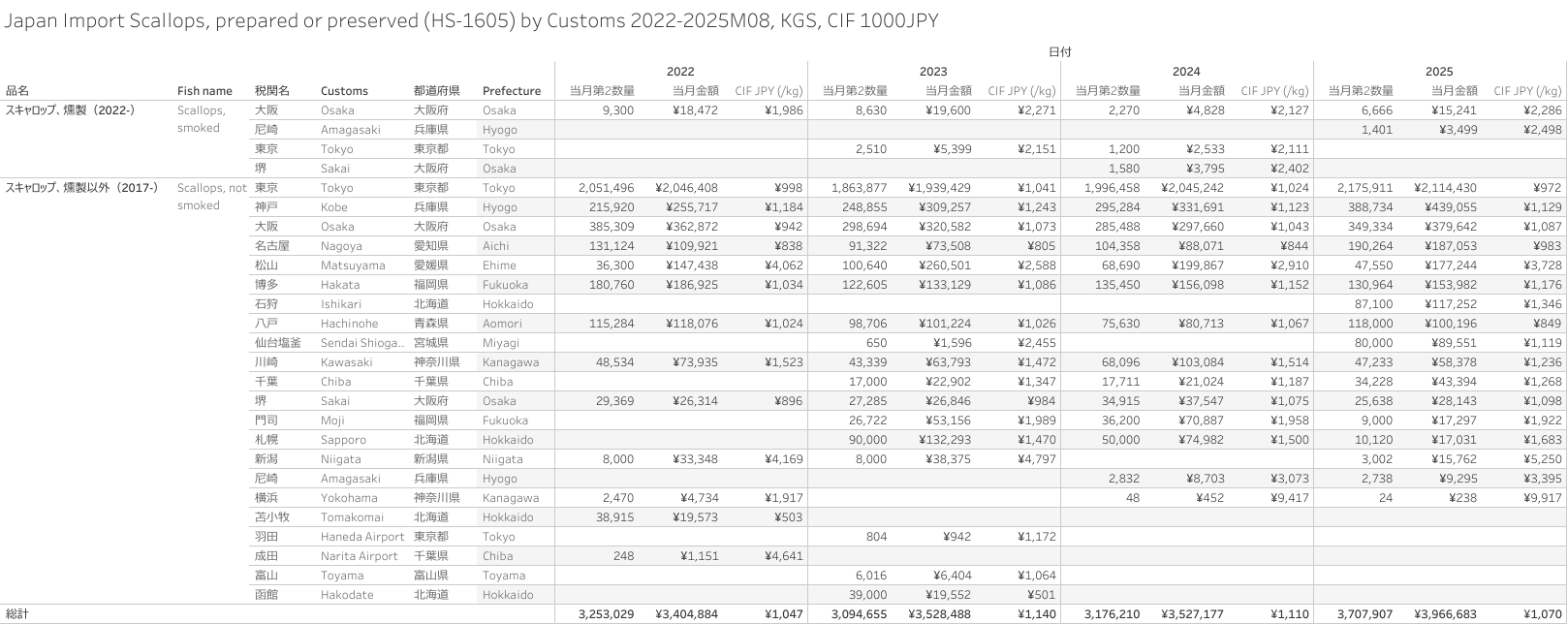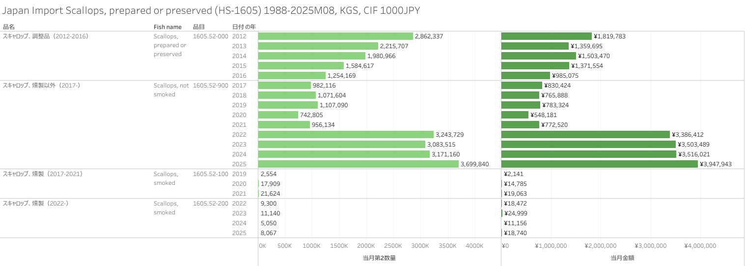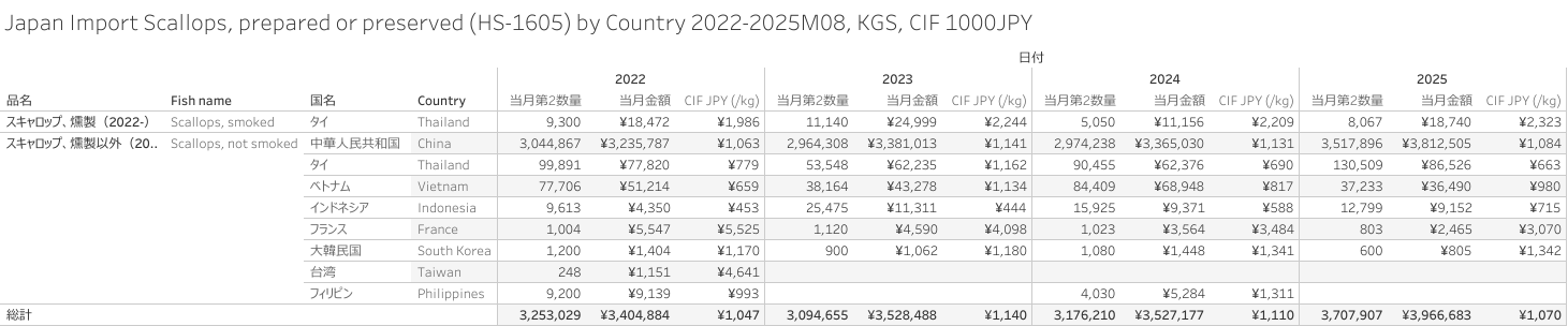 日本 スキャロップの調整品(HS-1605)輸入統計 2025年8月まで
