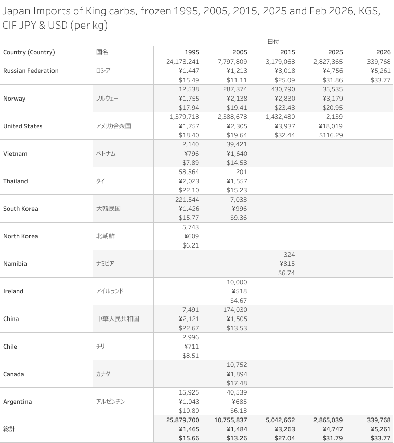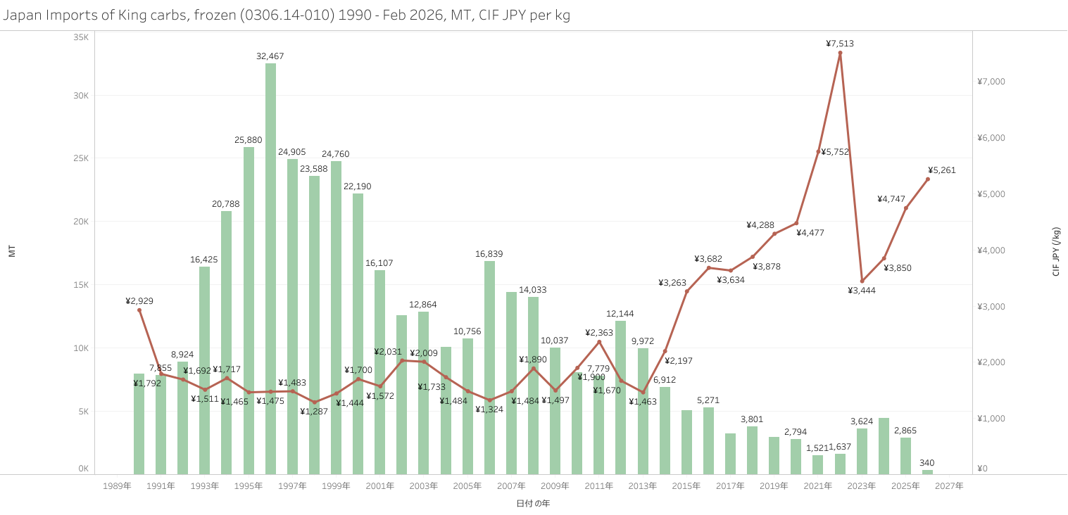 Japan Imports of King carbs, frozen 1988 - Feb 2026