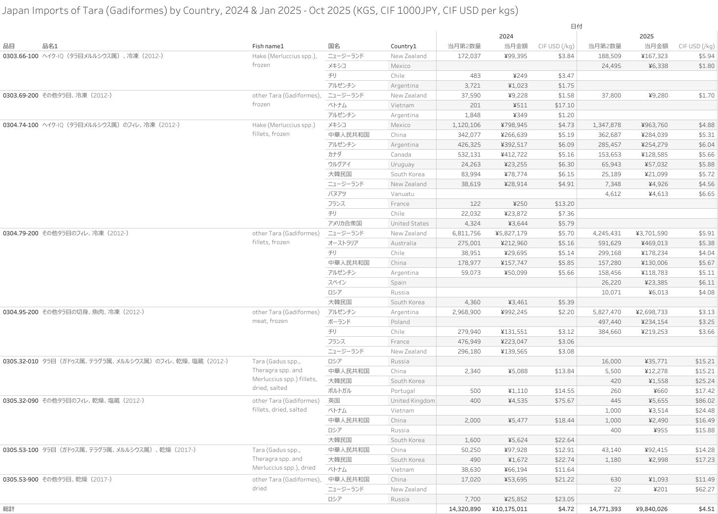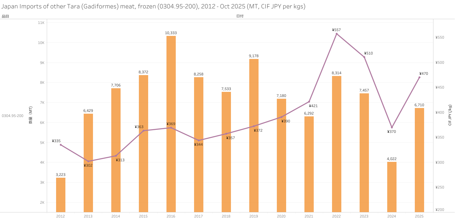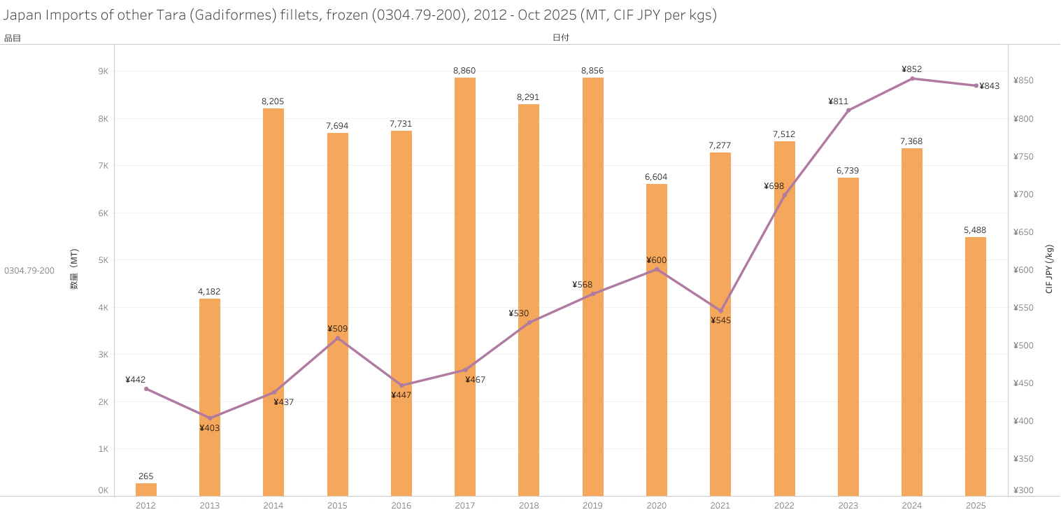 Japan Imports of Tara (Gadiformes) (HS-03) Jan 2025 - Oct 2025