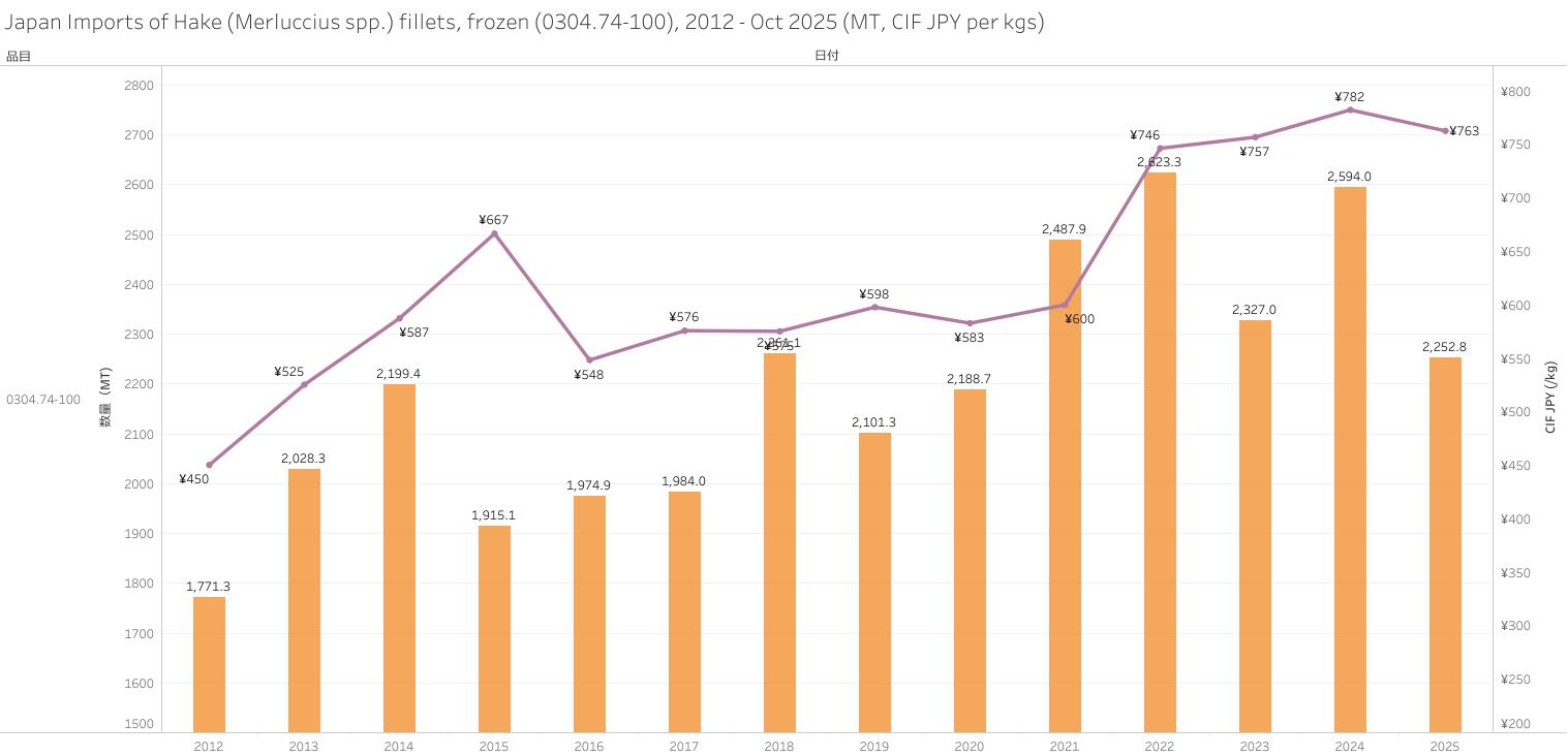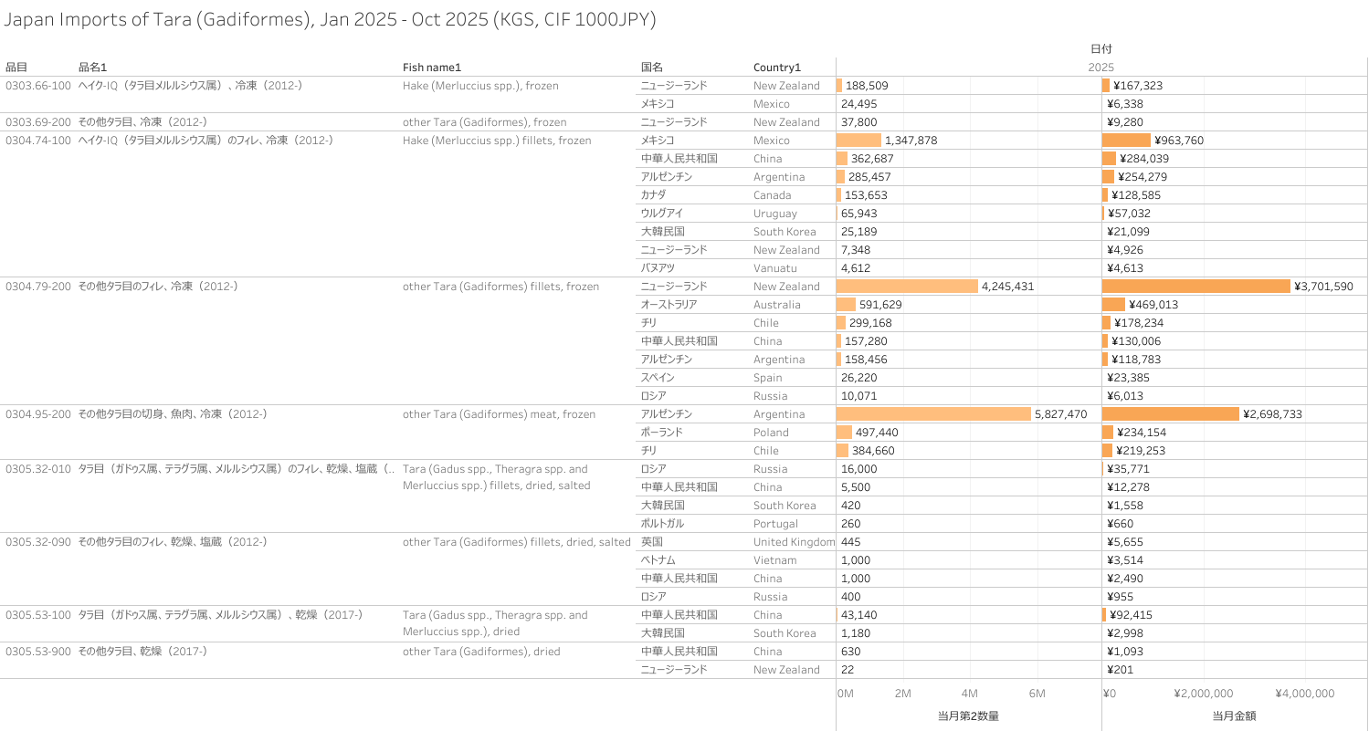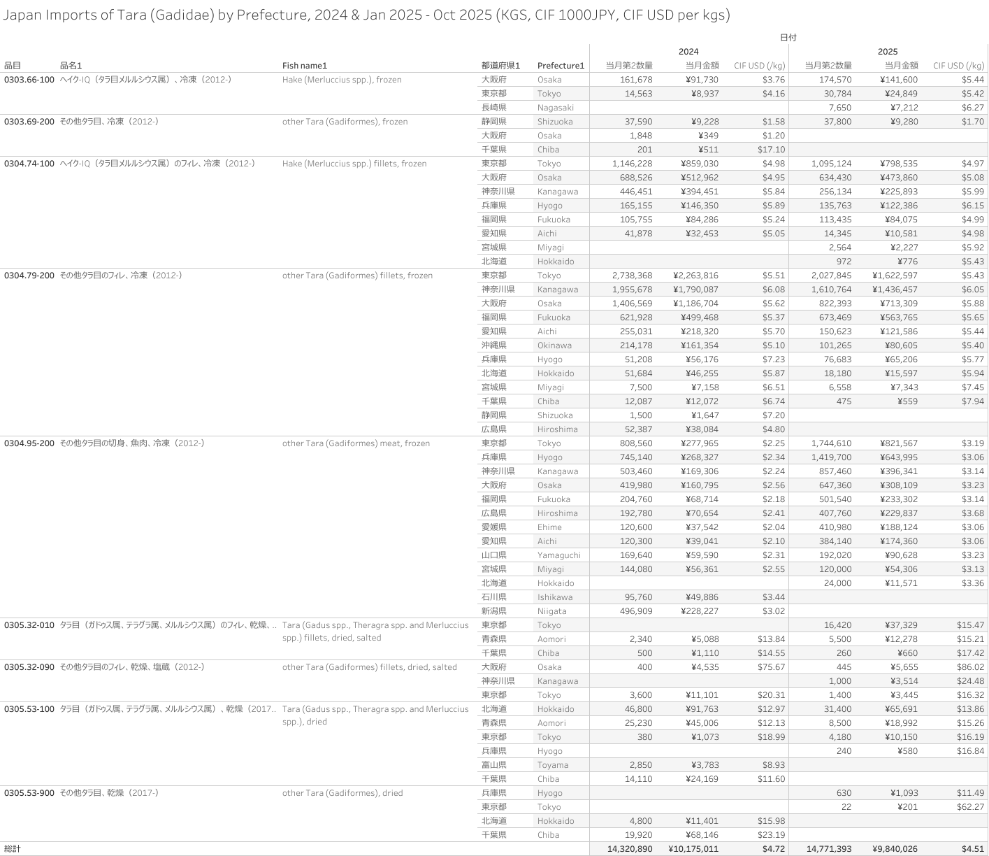 Japan Imports of Tara (Gadiformes) (HS-03) Jan 2025 - Oct 2025