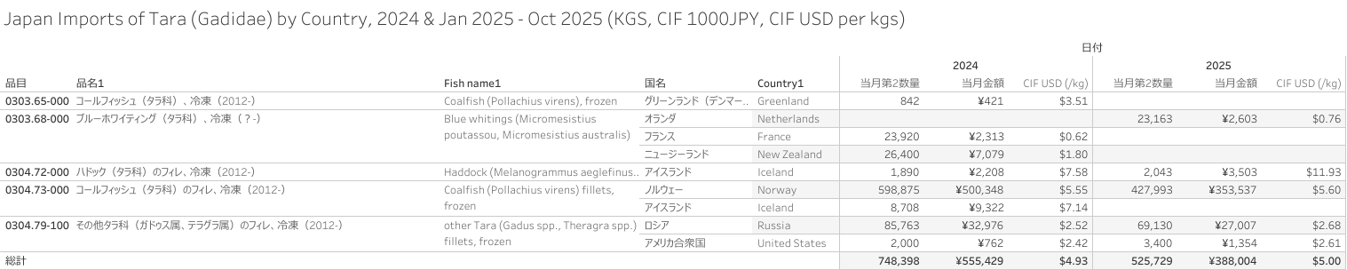 Japan Imports of Tara (Gadidae) (HS-03) Jan 2025 - Oct 2025
