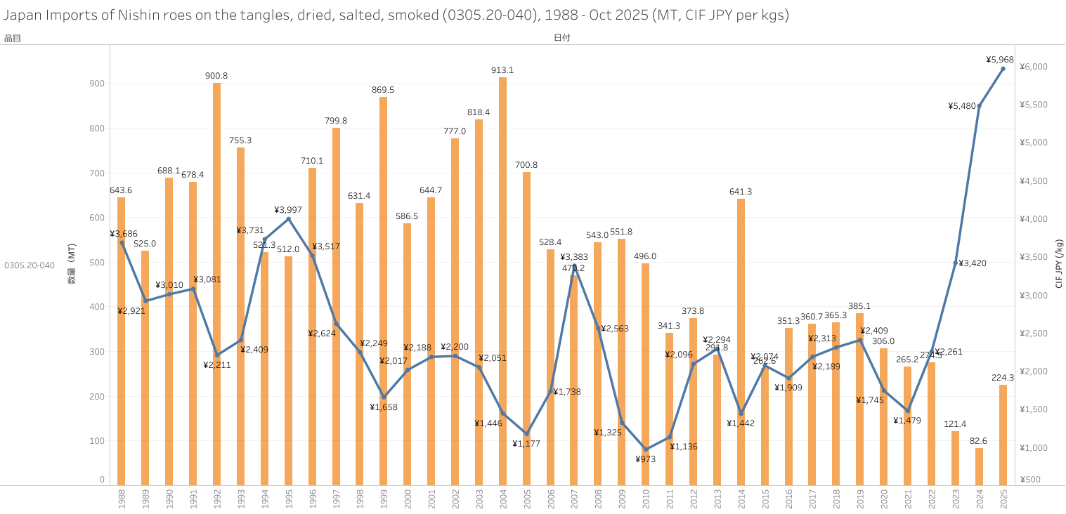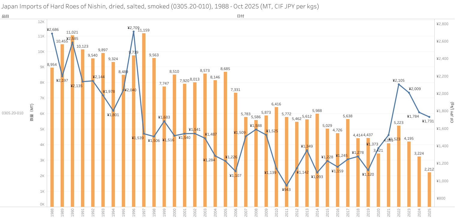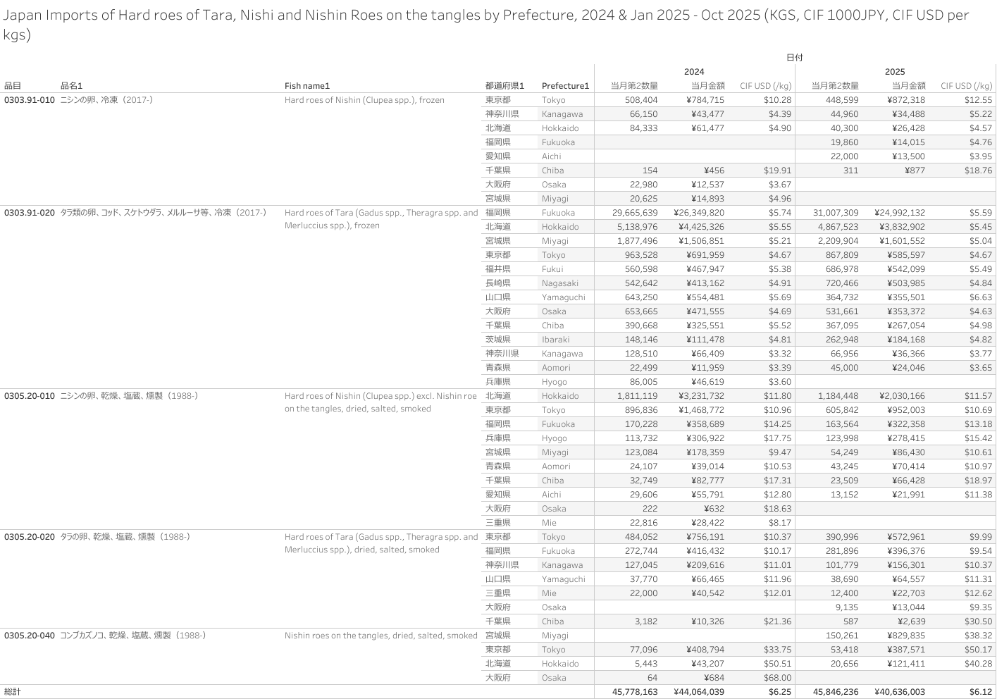 Japan Imports of Hard Roes of Tara and Nishin (HS-03) Jan 2025 - Oct 2025