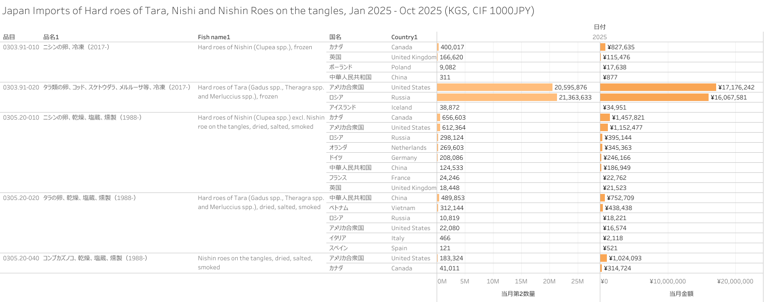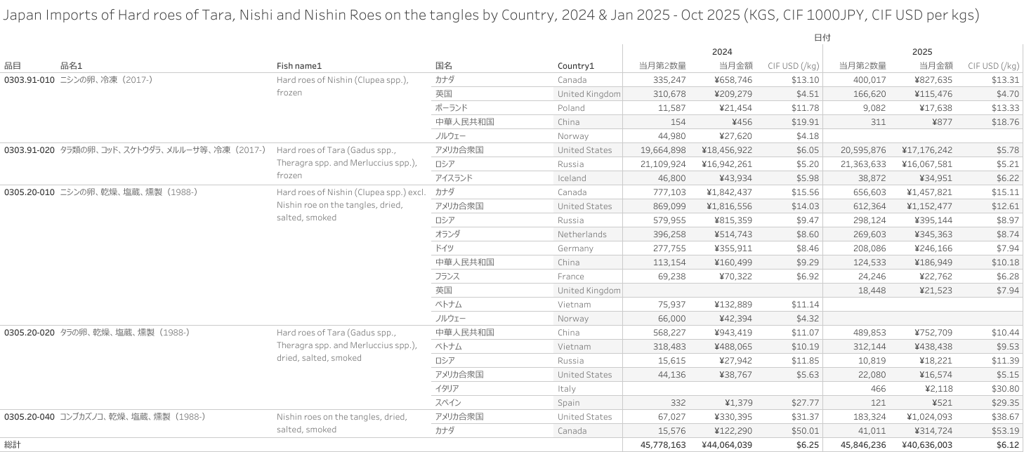 日本 タラ類、ニシンの卵(HS-03)輸入統計 2025年01月-10月