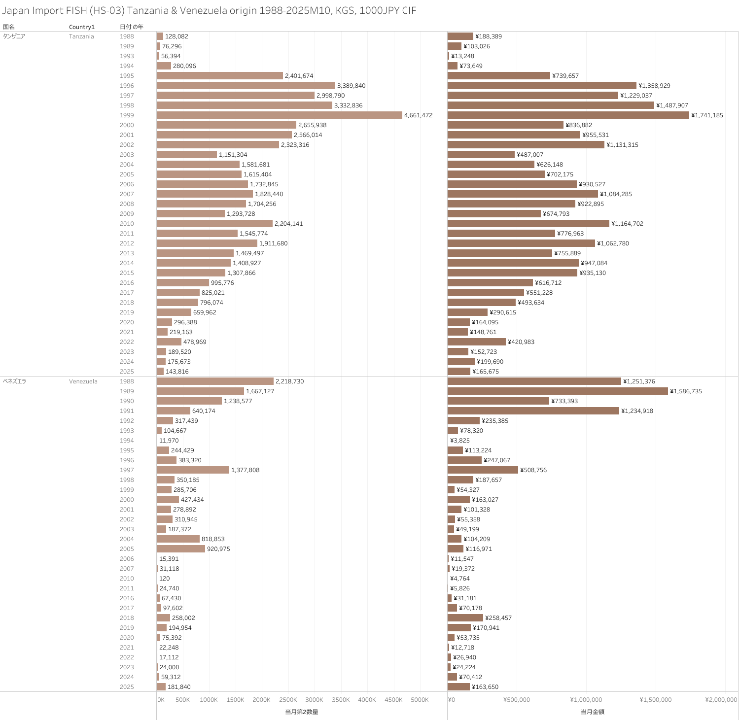 日本 タンザニア&ベネズエラ産水産物(HS-03)輸入統計 2025年10月まで