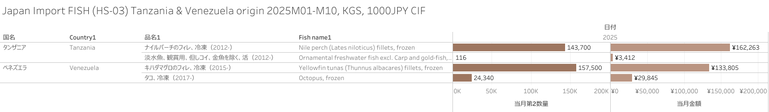 日本 タンザニア&ベネズエラ産水産物(HS-03)輸入統計 2025年10月まで