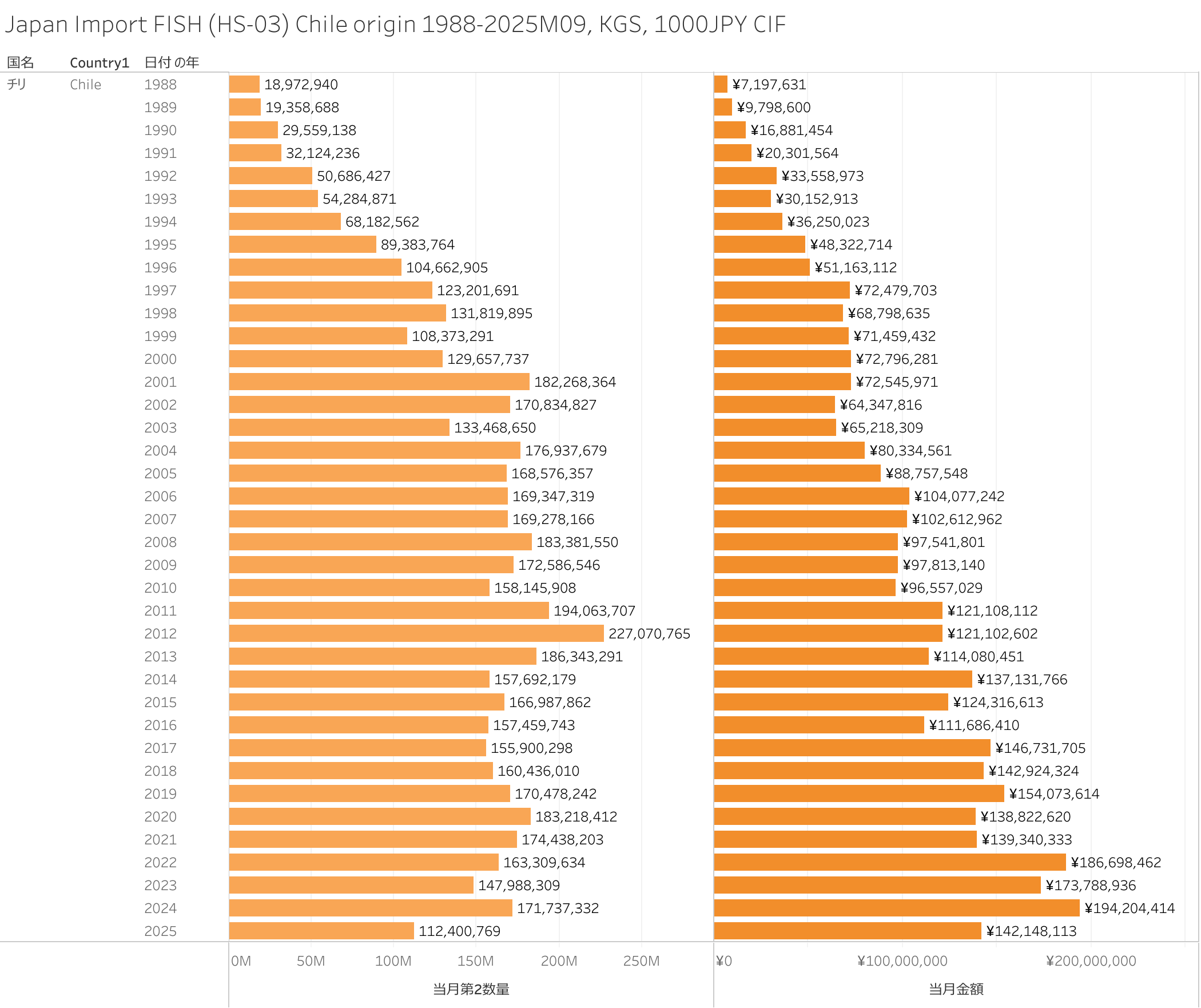 日本 チリ産水産物(HS-03)輸入統計 2025年09月まで