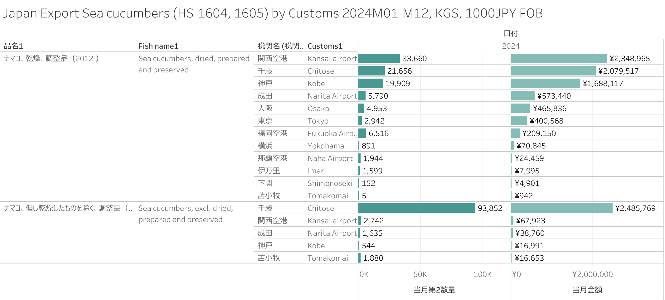 日本 ナマコの調整品(HS-1604, 1605)輸出統計 2024年12月まで