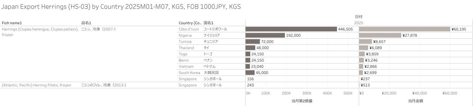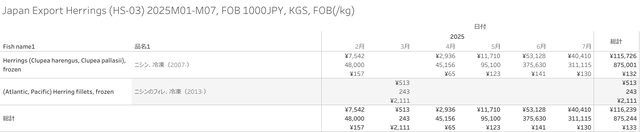 日本 ニシン(HS-03)輸出統計 2025年7月まで