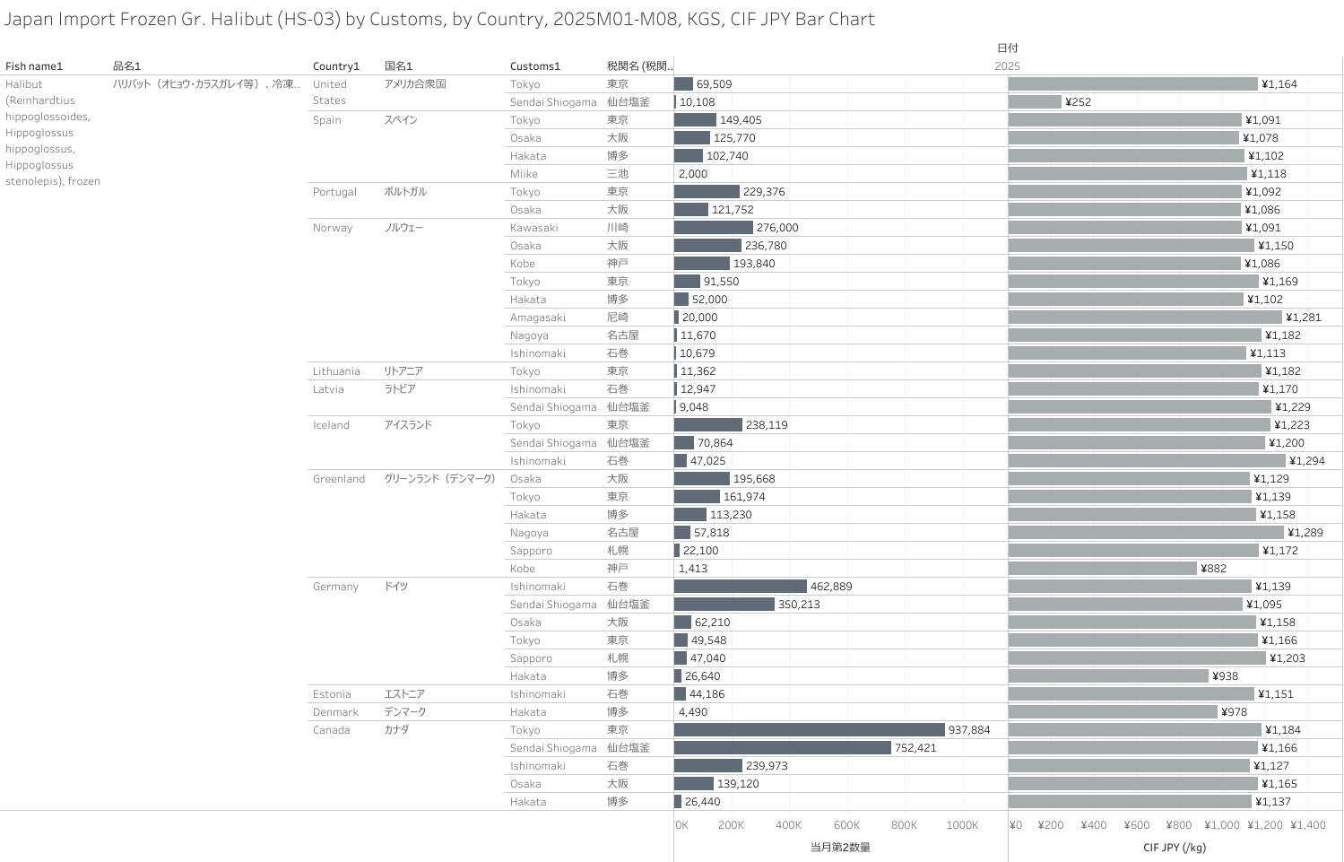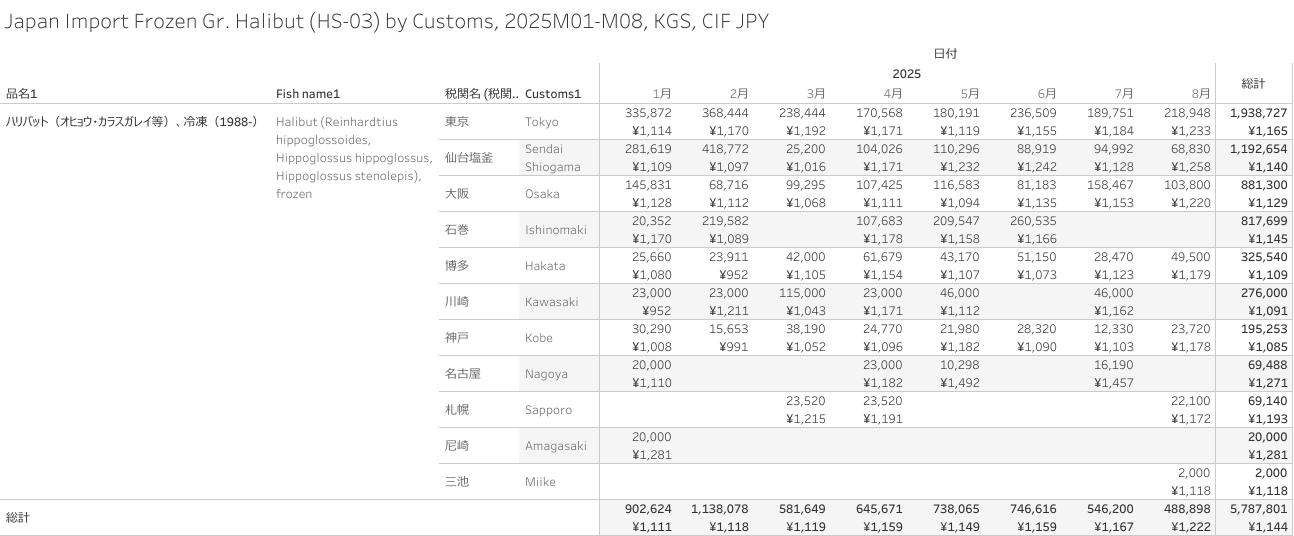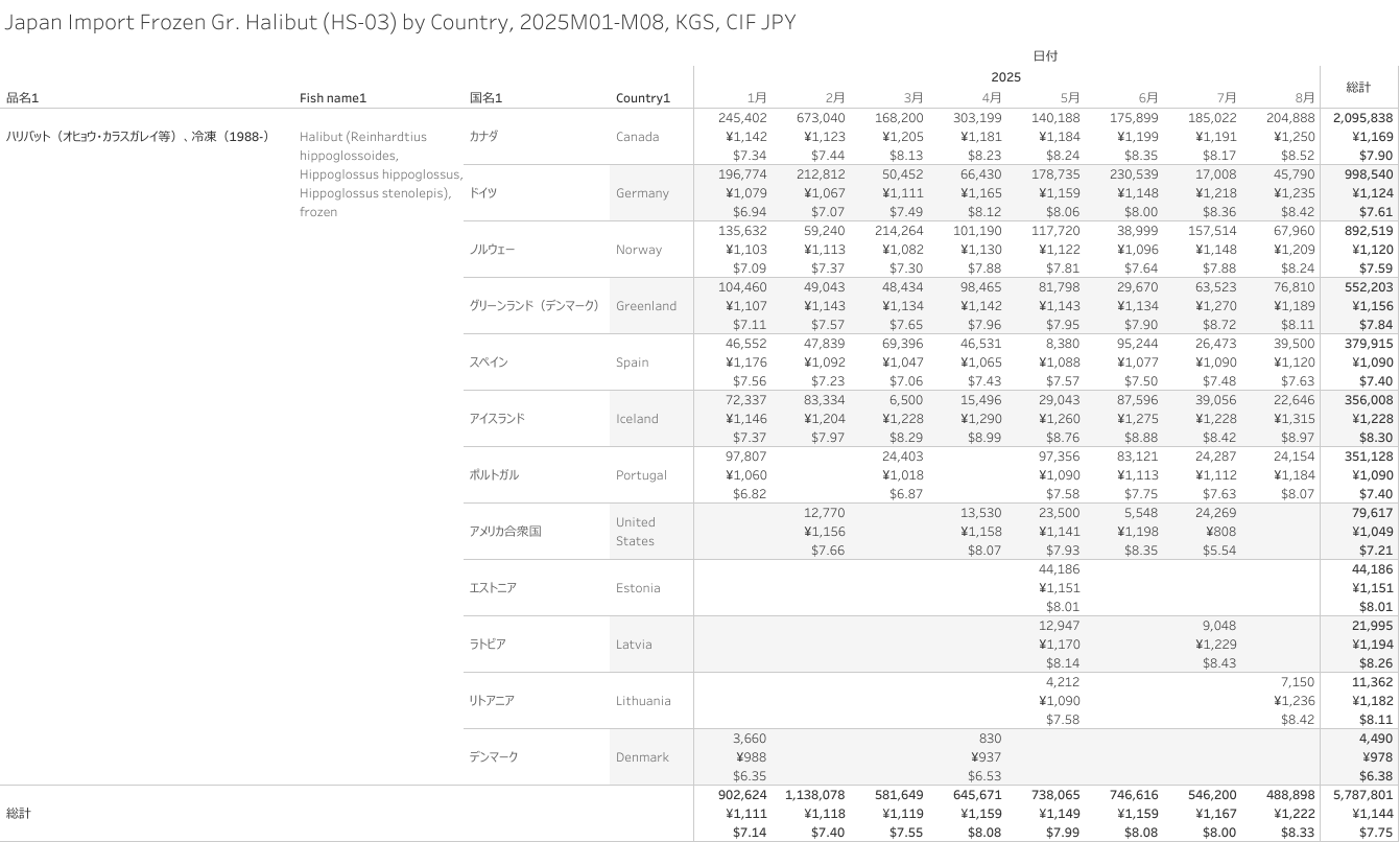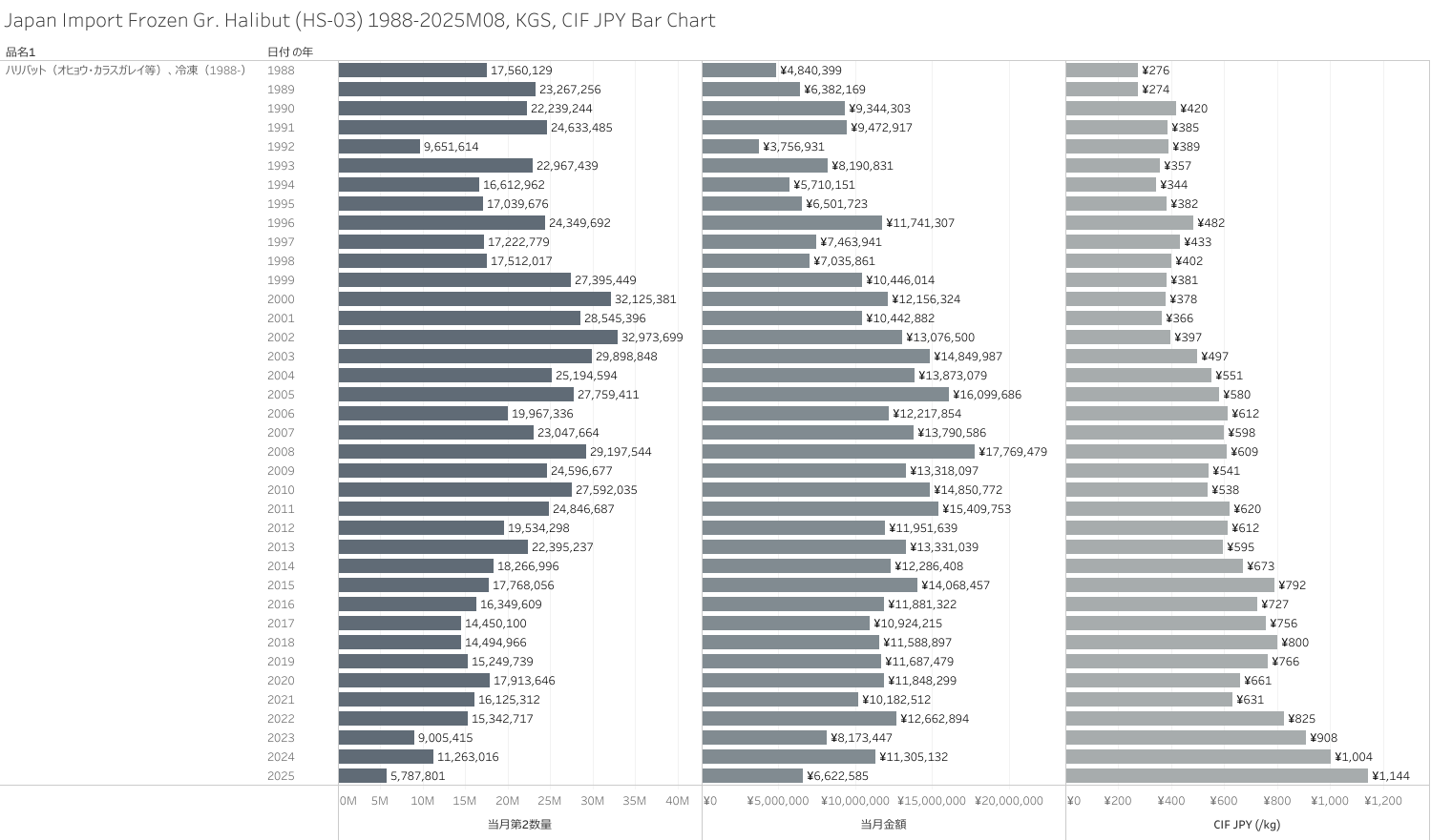 日本 ハリバット(HS-03)輸入統計 2025年8月まで