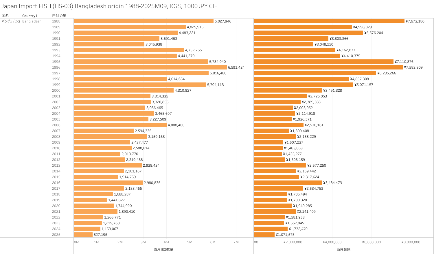 日本 バングラディッシュ産水産物(HS-03)輸入統計 2025年09月まで