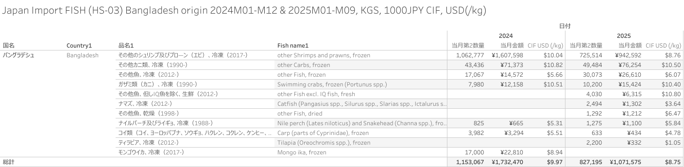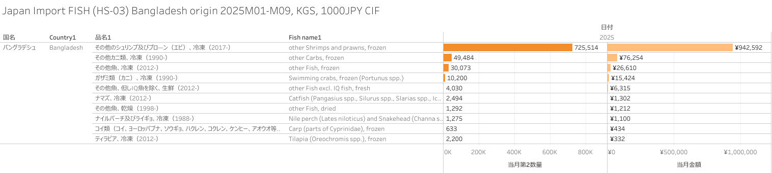 日本 バングラディッシュ産水産物(HS-03)輸入統計 2025年09月まで