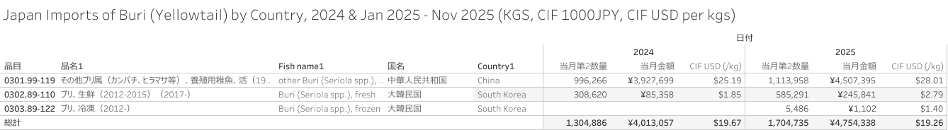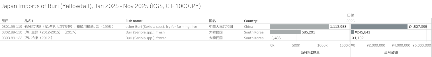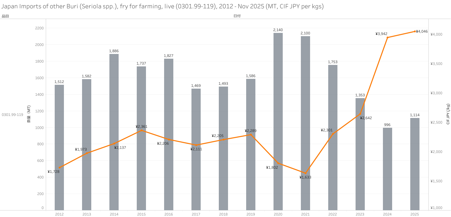 Japan Imports of Buri (HS-03) Jan 2025 - Nov 2025
