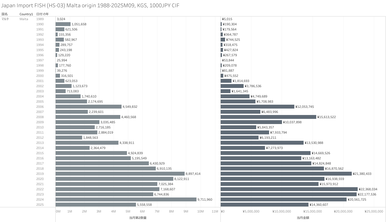 日本 マルタ産水産物(HS-03)輸入統計 2025年09月まで
