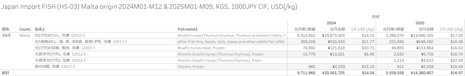 日本 マルタ産水産物(HS-03)輸入統計 2025年09月まで