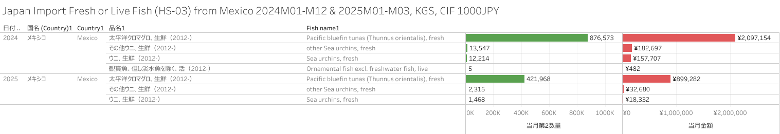 日本 メキシコ産 活・生鮮の水産物(HS-03)輸入統計 2024年12月+2025年3月まで