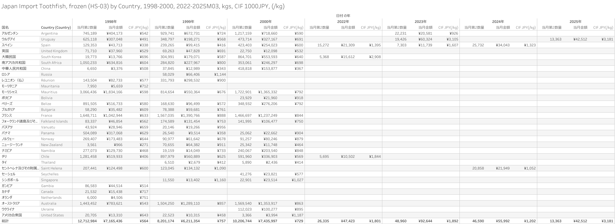 Japan Import Toothfish, frozen (HS-03) 1998-2025M03