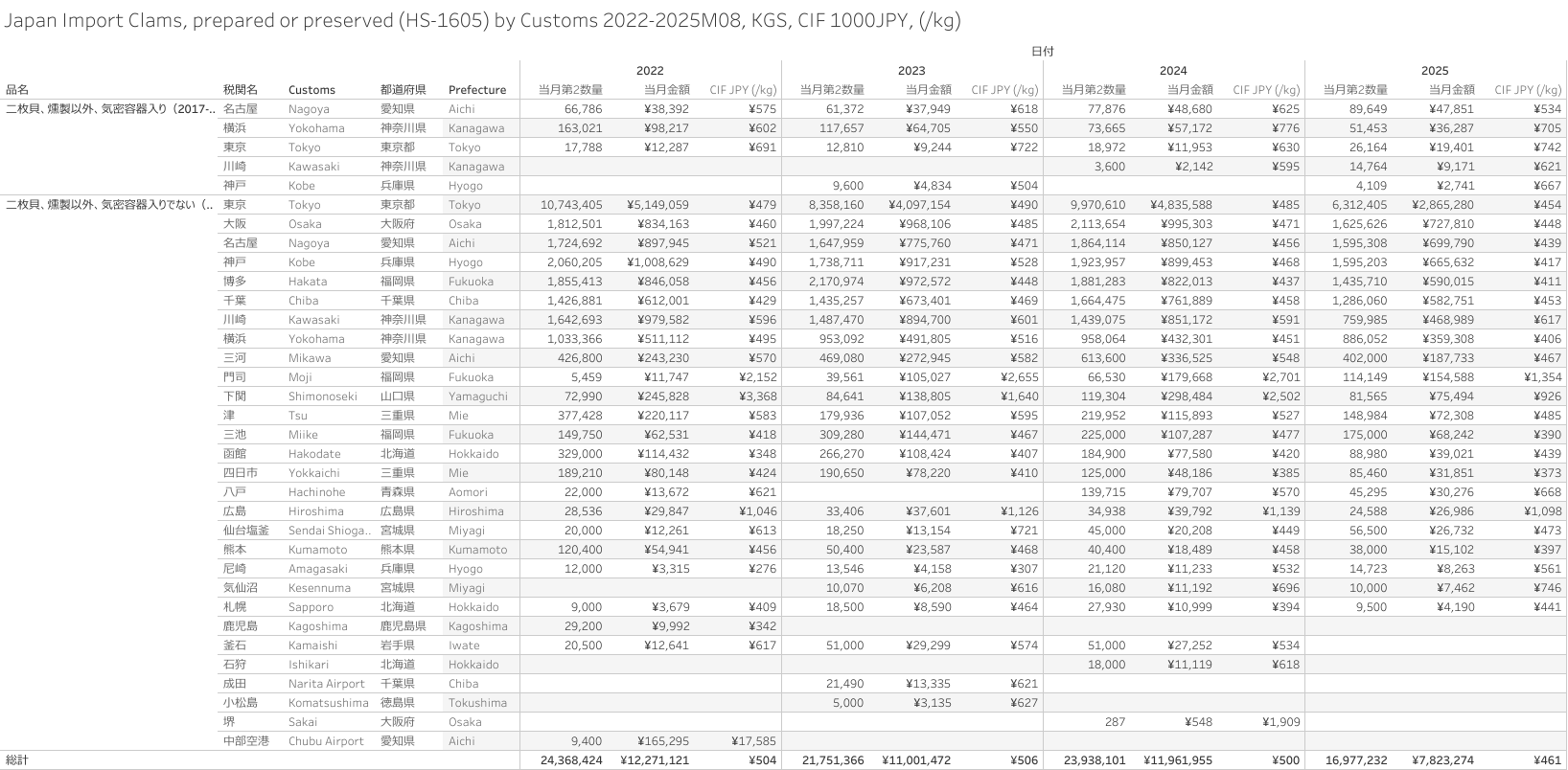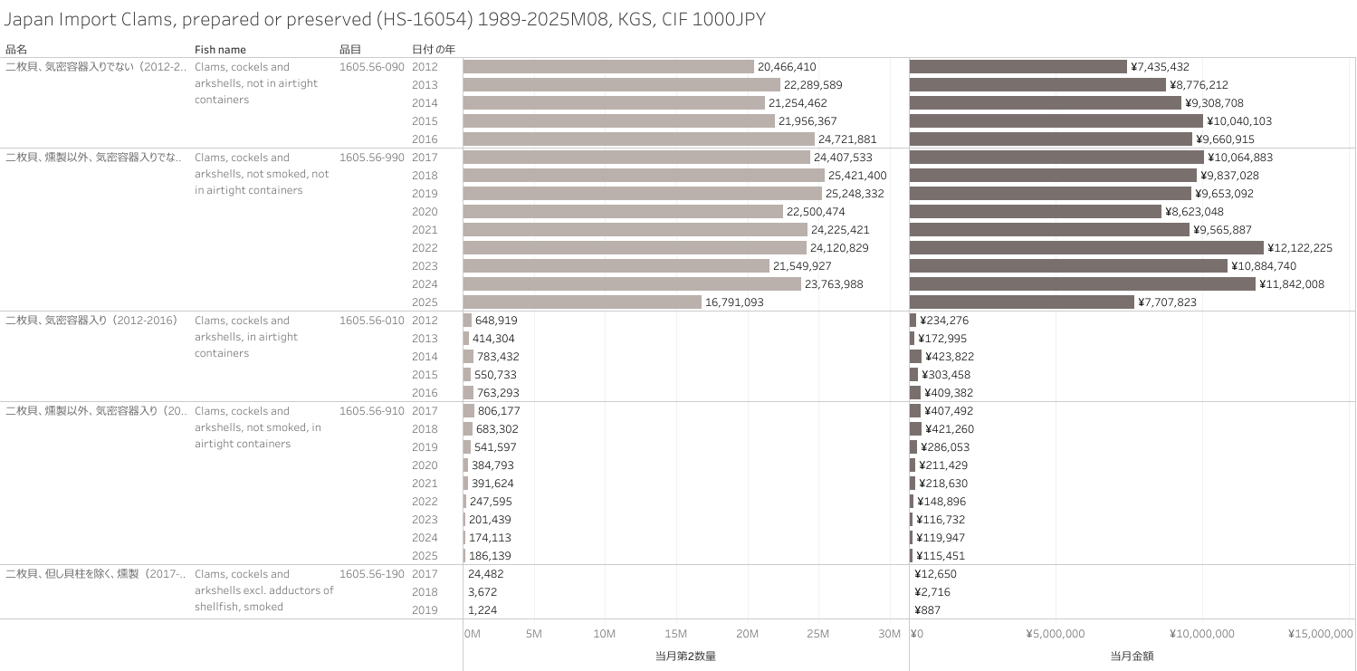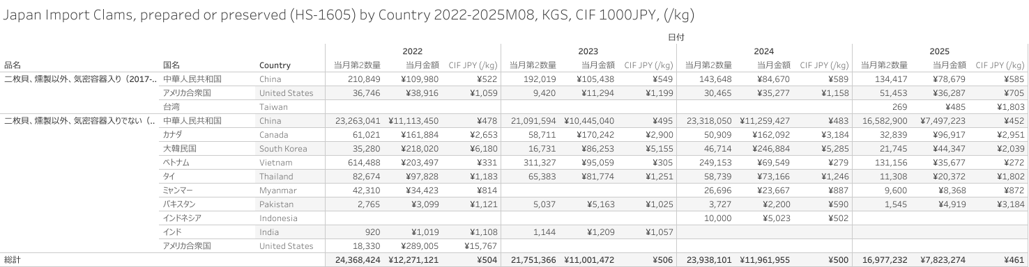 日本 二枚貝の調整品(HS-1605)輸入統計 2025年8月まで