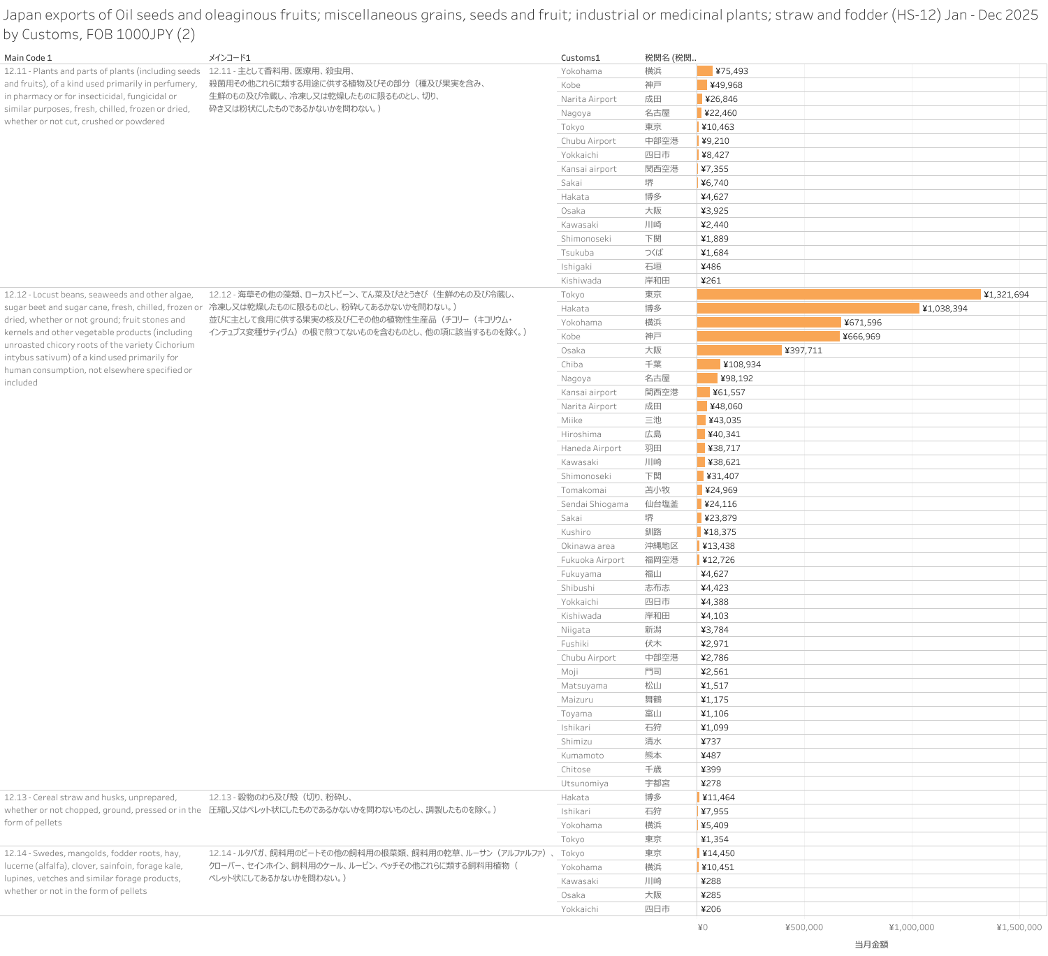 日本 採油用の種及び果実、各種の種及び果実、工業用又は医薬用の植物並びにわら及び飼料用植物(HS-12) 輸出統計 2025年12月まで