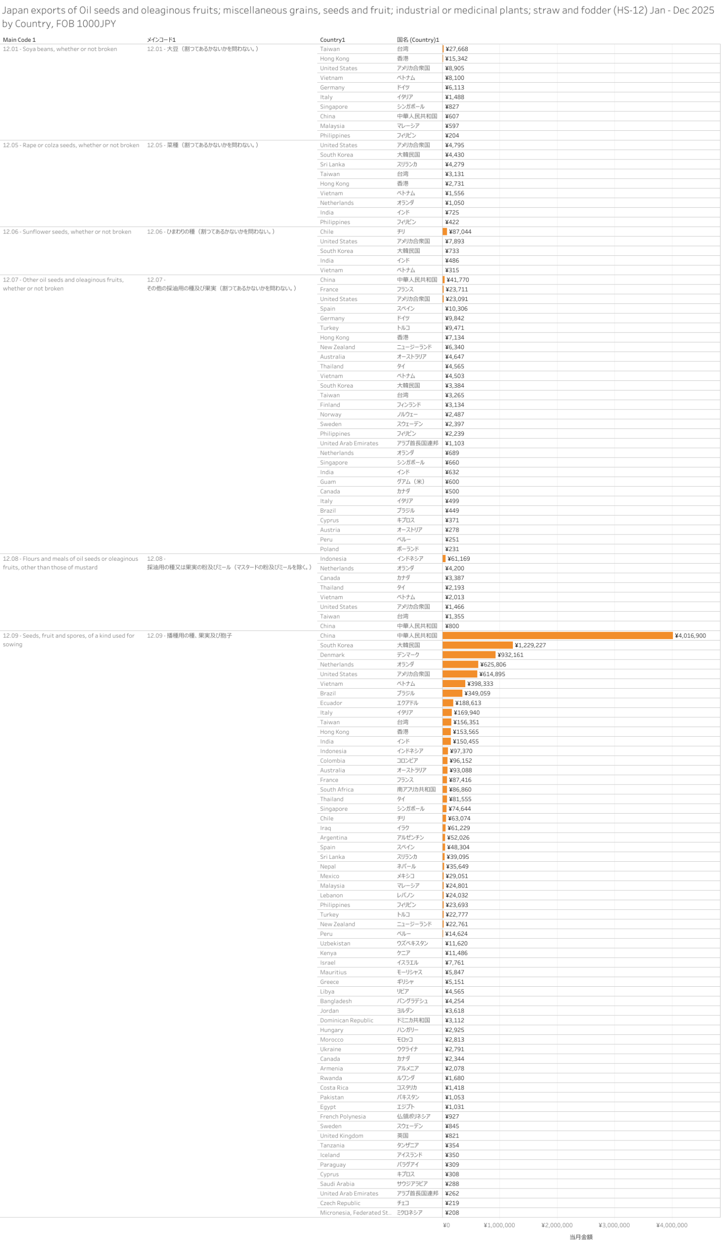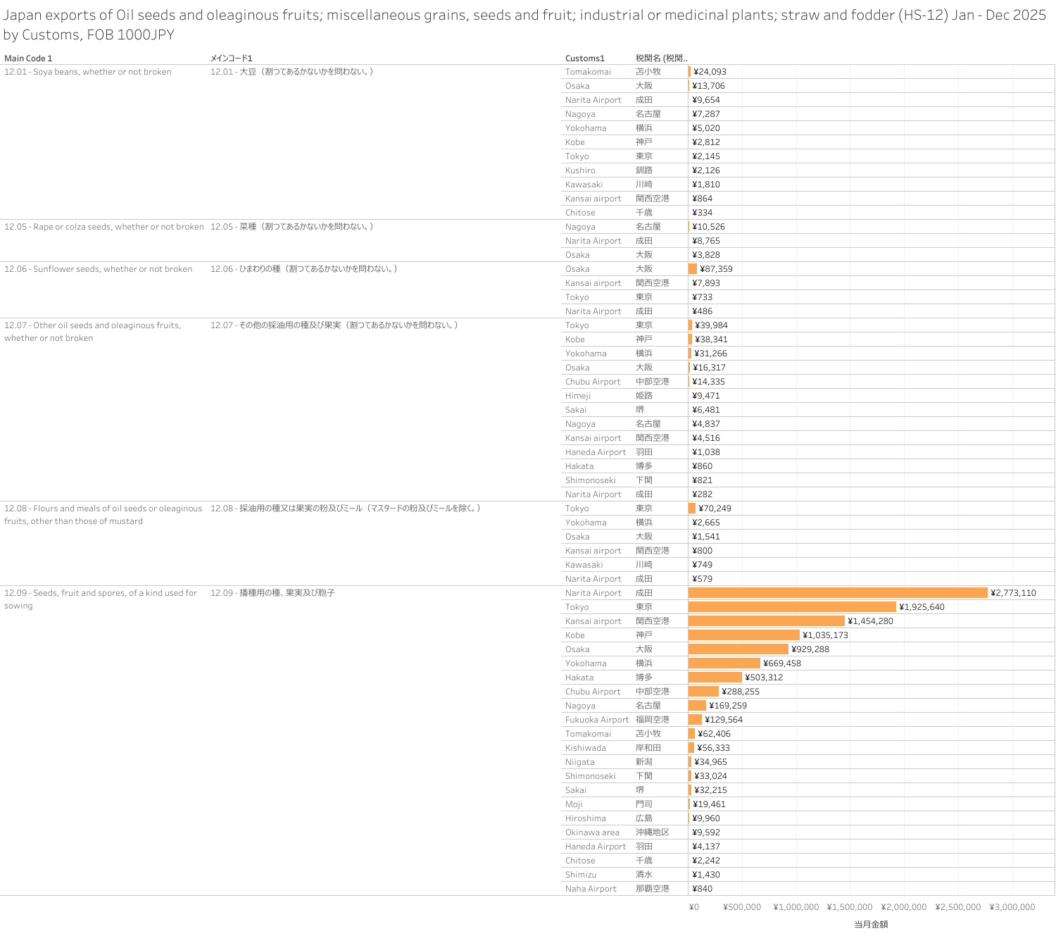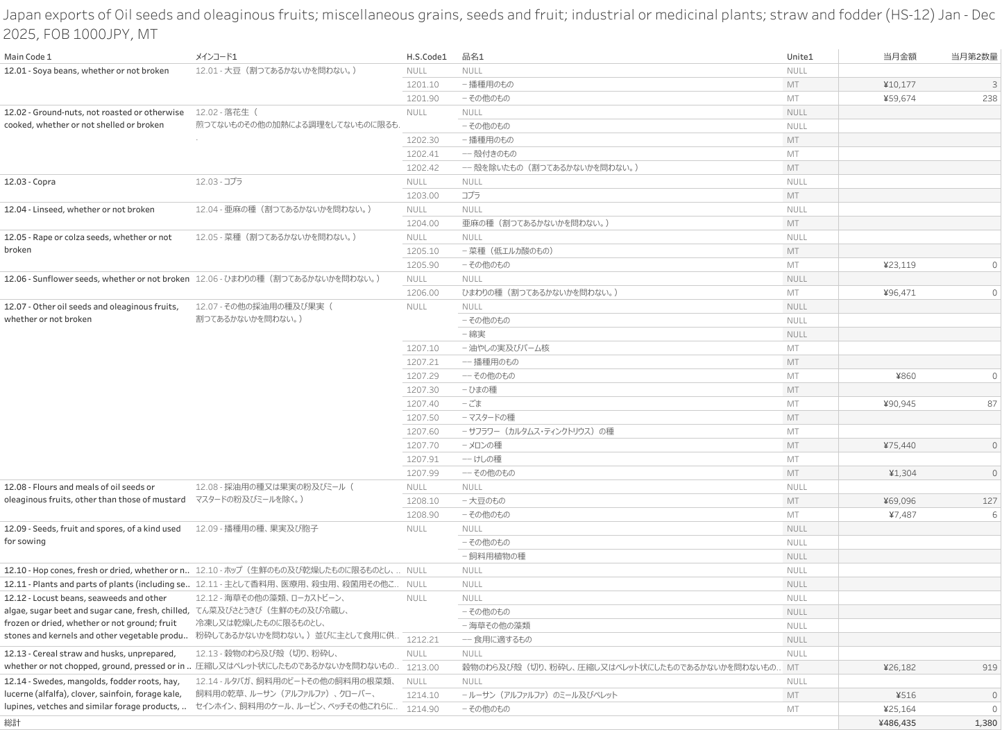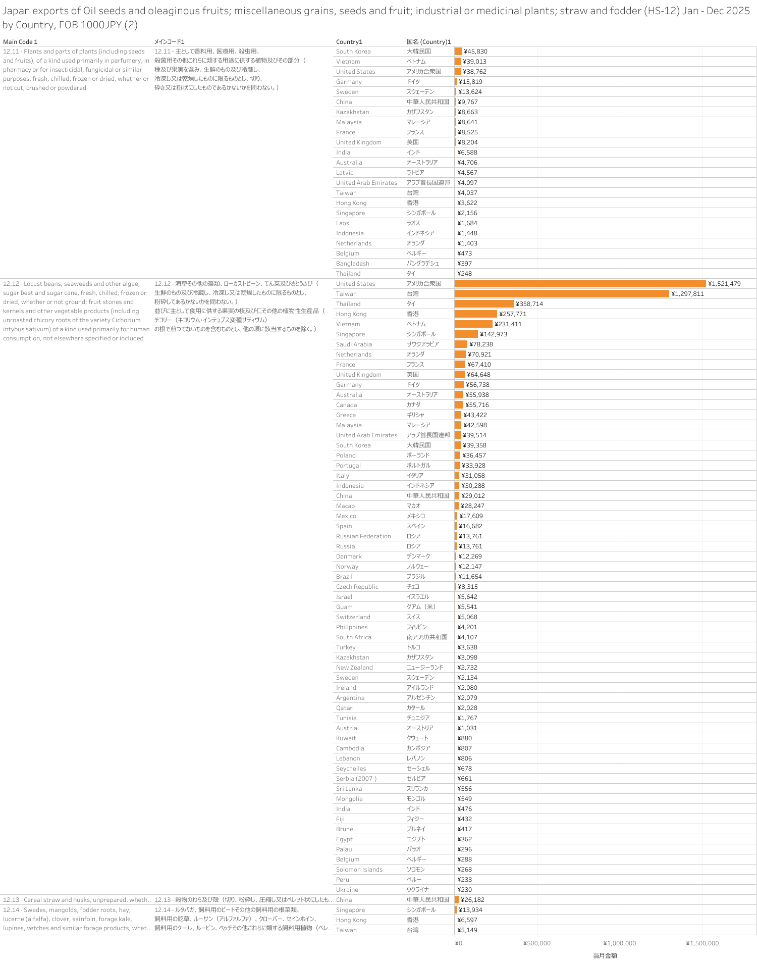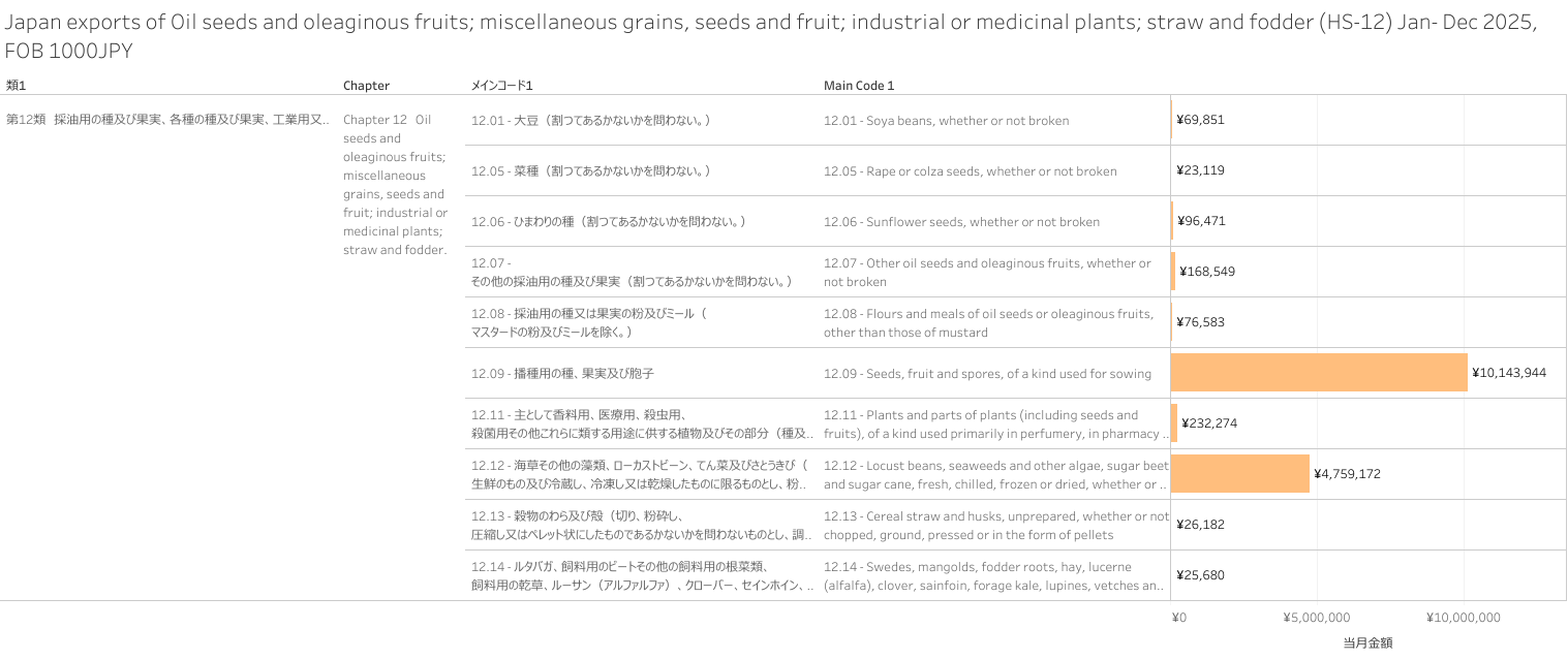 日本 採油用の種及び果実、各種の種及び果実、工業用又は医薬用の植物並びにわら及び飼料用植物(HS-12) 輸出統計 2025年12月まで
