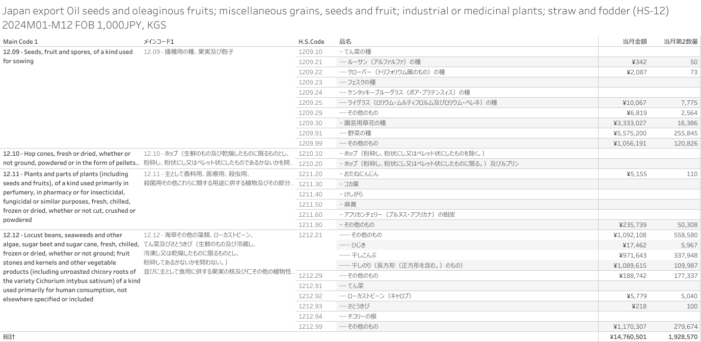Japan Export Oil seeds and oleaginous fruits; miscellaneous grains, seeds and fruit; industrial or medicinal plants; straw and fodder. (HS-12) 2024M01-M12