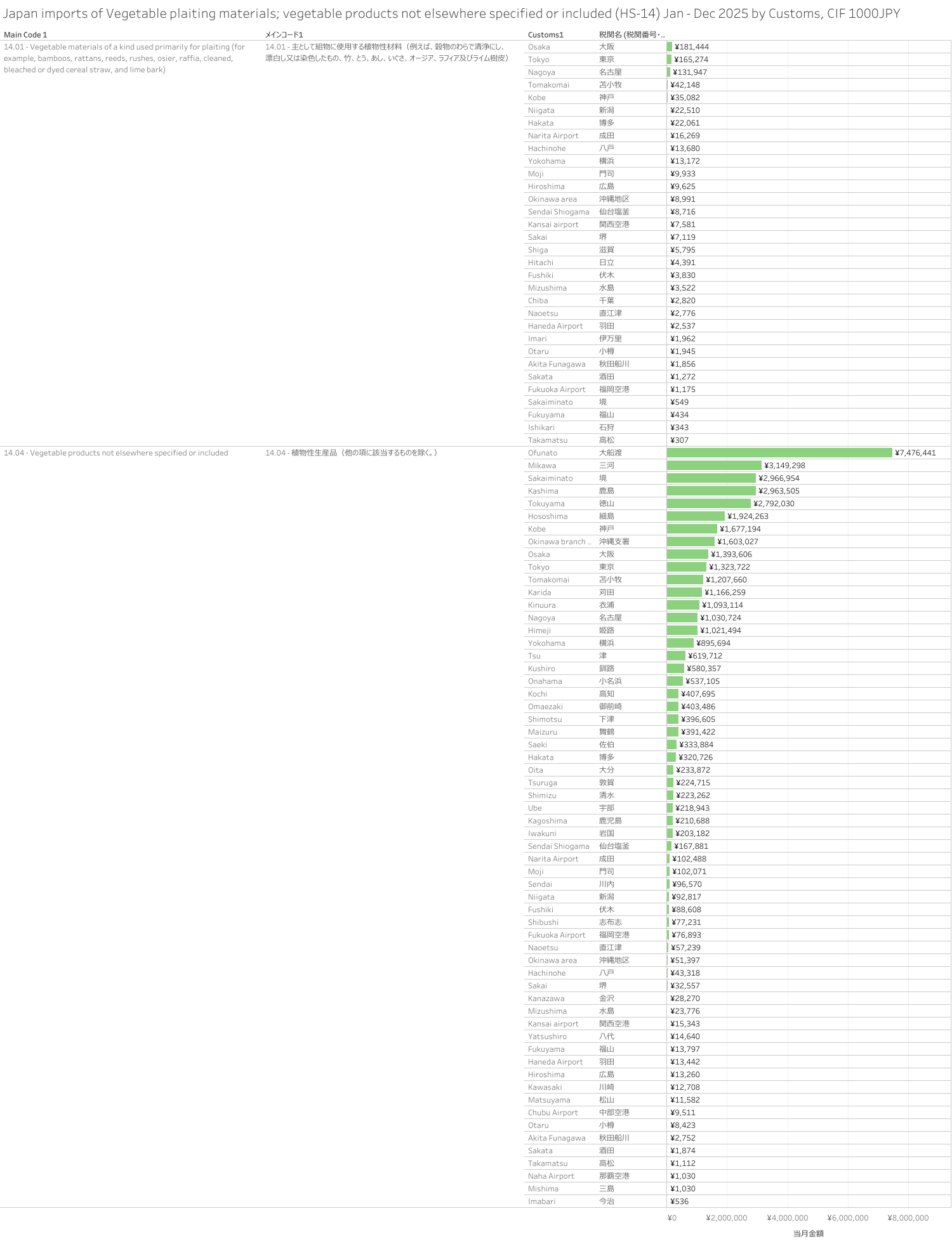 日本 植物性の組物材料及び他の類に該当しない植物性生産品(HS-14) 輸入統計 2025年12月まで